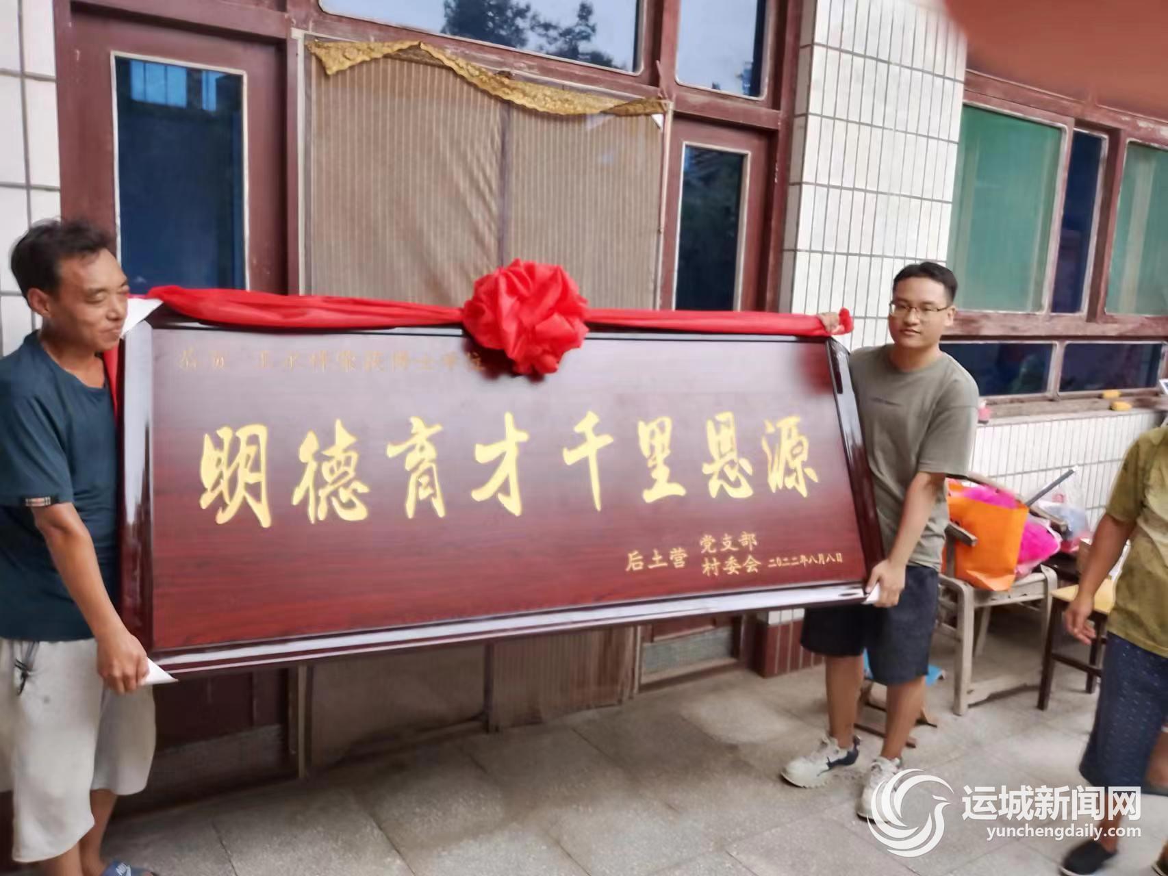 ▲8月9日,临猗县耽子镇后土营村党支部、村委会,为该村王永祥家庭赠送“明德育才 千里思源”牌匾。据了解,今年6月,王永祥被中国科学院大学精密测量科学与技术创新研究院录取,攻读博士学位研究生,后土营村党支部、村委会对王永祥刻苦学习、勤奋努力的求学精神予以鼓励,并通过赠送牌匾弘扬笃行不怠、耕读传家的良好村风。