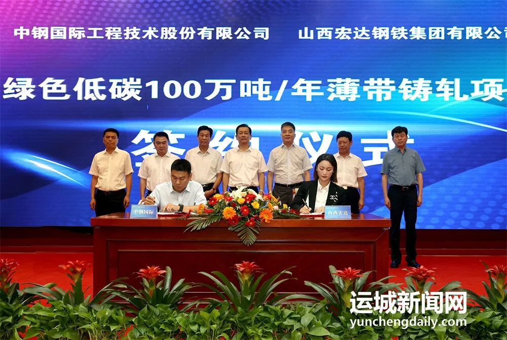 本报讯(记者 王文军)8月16日,山西宏达钢铁集团有限公司和中钢国际工程技术股份有限公司绿色低碳年产100万吨薄带铸轧项目签约仪式举行。市委书记丁小强出席并见证签约。中钢国际工程技术股份有限公司董事长陆鹏程致辞。市领导乔登州、李晓武等出席并见证签约。副市长李哲致辞。