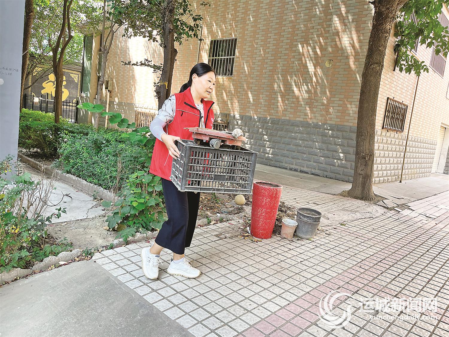 8月12日上午10时,见到网格员董敏时,她正在辖区国土资源局第三家属院当“搬运工”。塑料桶、纸箱、花盆……董敏从地下室到楼道口来回跑了四五趟,将堆积在地下室的杂物一一搬出,汗珠从她的额头滑落到脸颊。