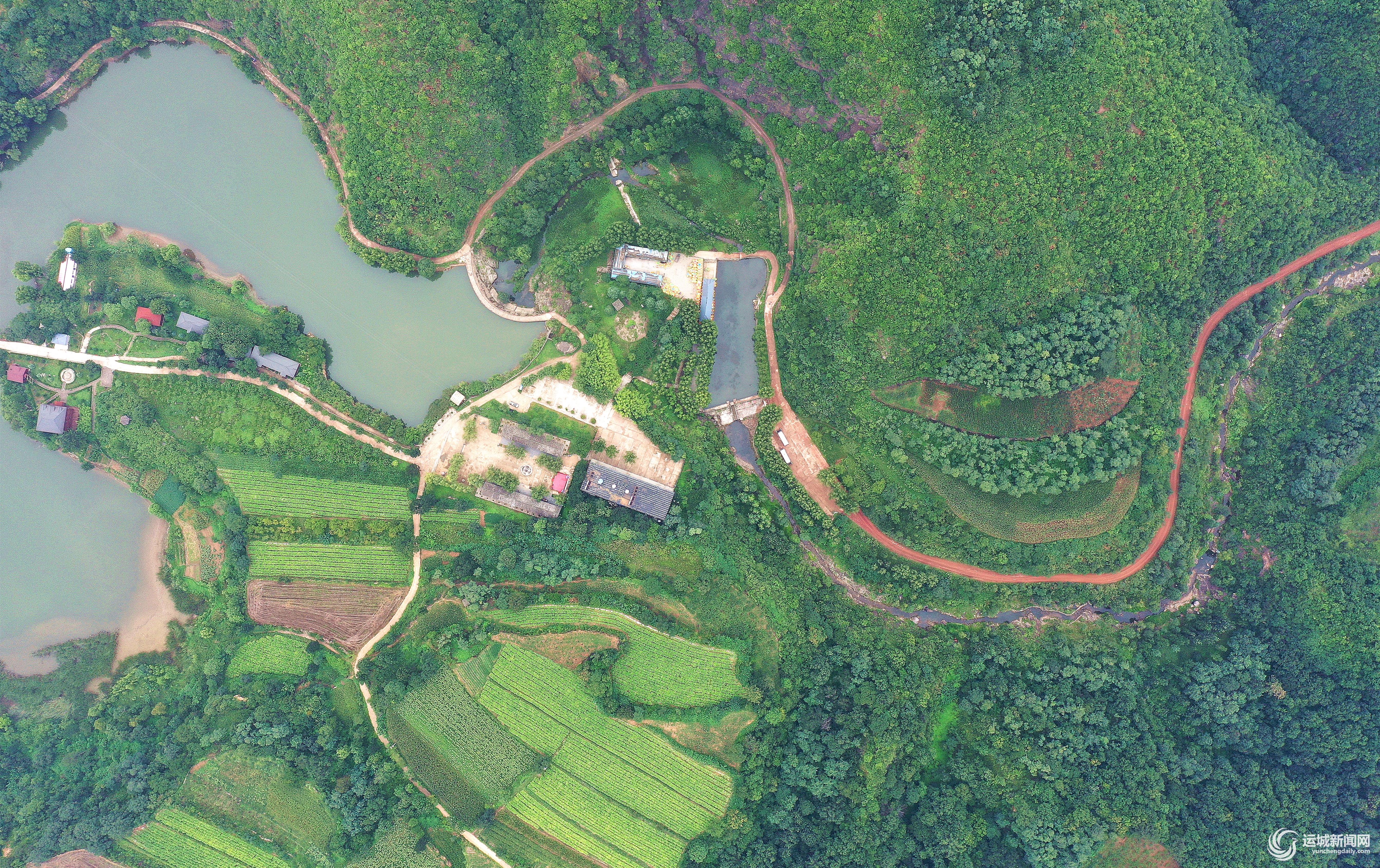 ▲8月17日,从空中拍摄的夏县中条山腹地泗交大峡谷,绿水青山与弯弯山道、田园庄禾交相辉映,构成一幅风光旖旎的生态画卷。
