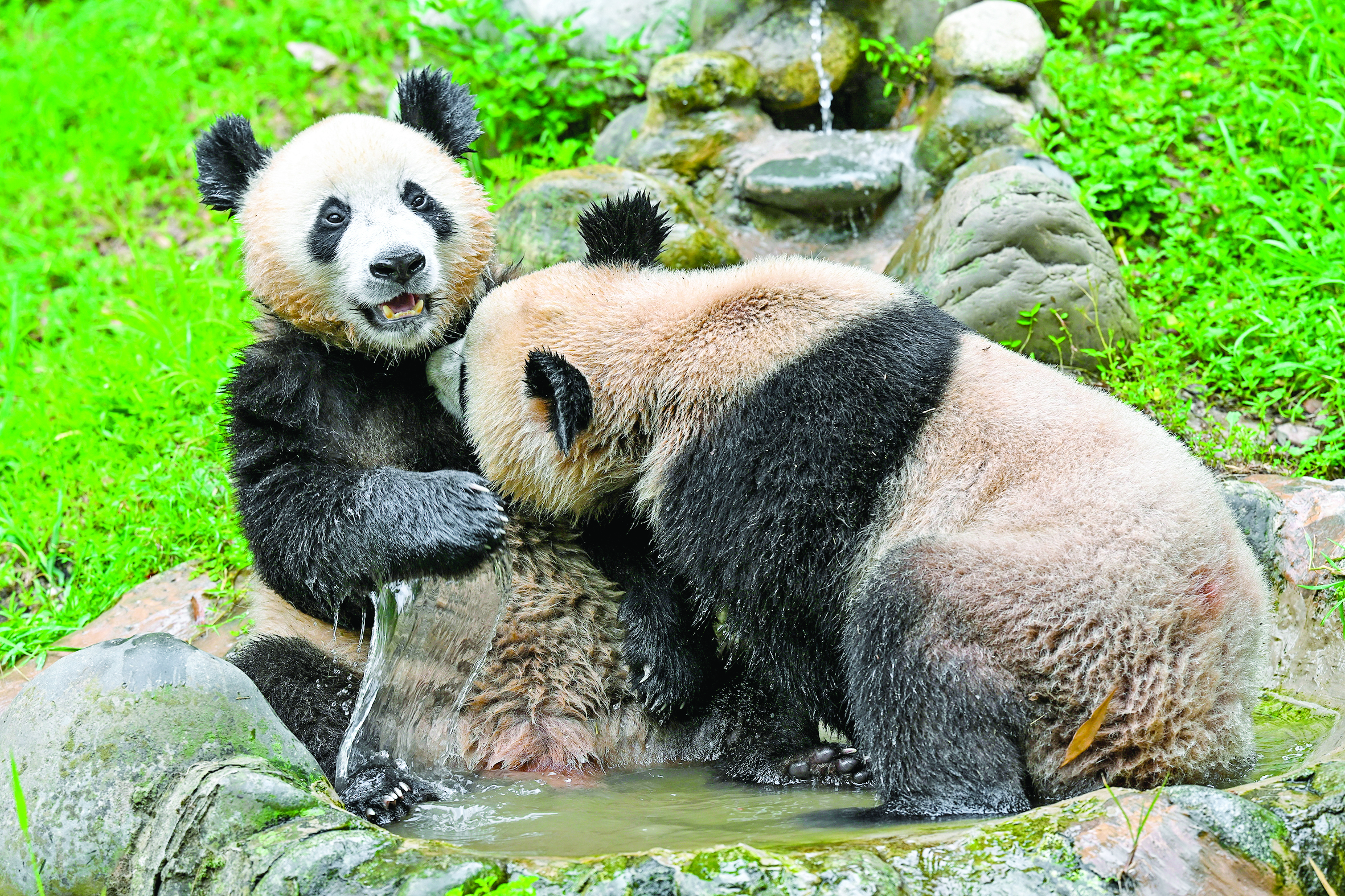 8月18日,中国大熊猫保护研究中心都江堰基地的大熊猫在圈舍的水池里戏水玩耍。