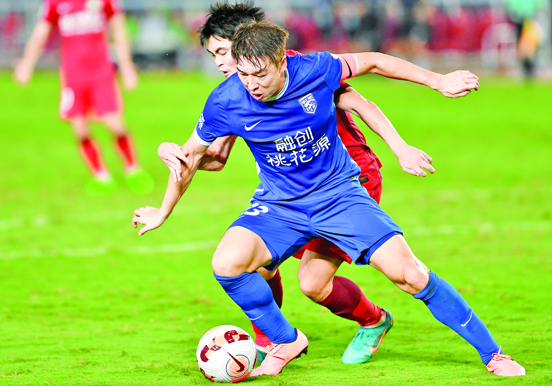 ▲8月17日,武汉三镇队球员任航(前)在比赛中拼抢。 新华社记者 李嘉南 摄
