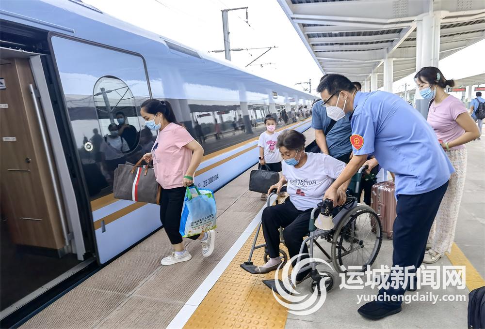 图为8月15日,运城北站客运人员帮扶重点旅客上车。