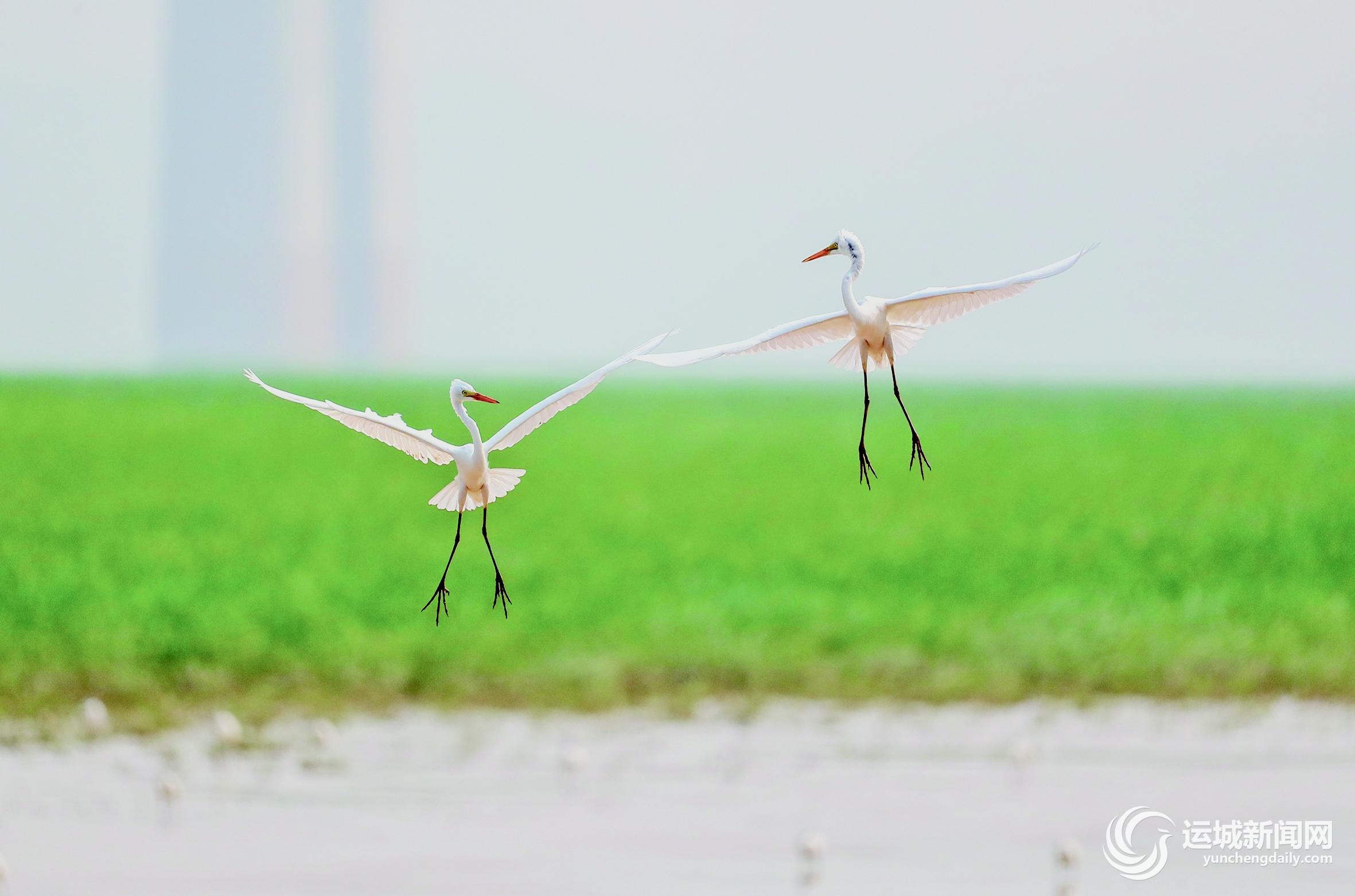 8月17日,两只白鹭在平陆县黄河湿地上空翩翩起舞。