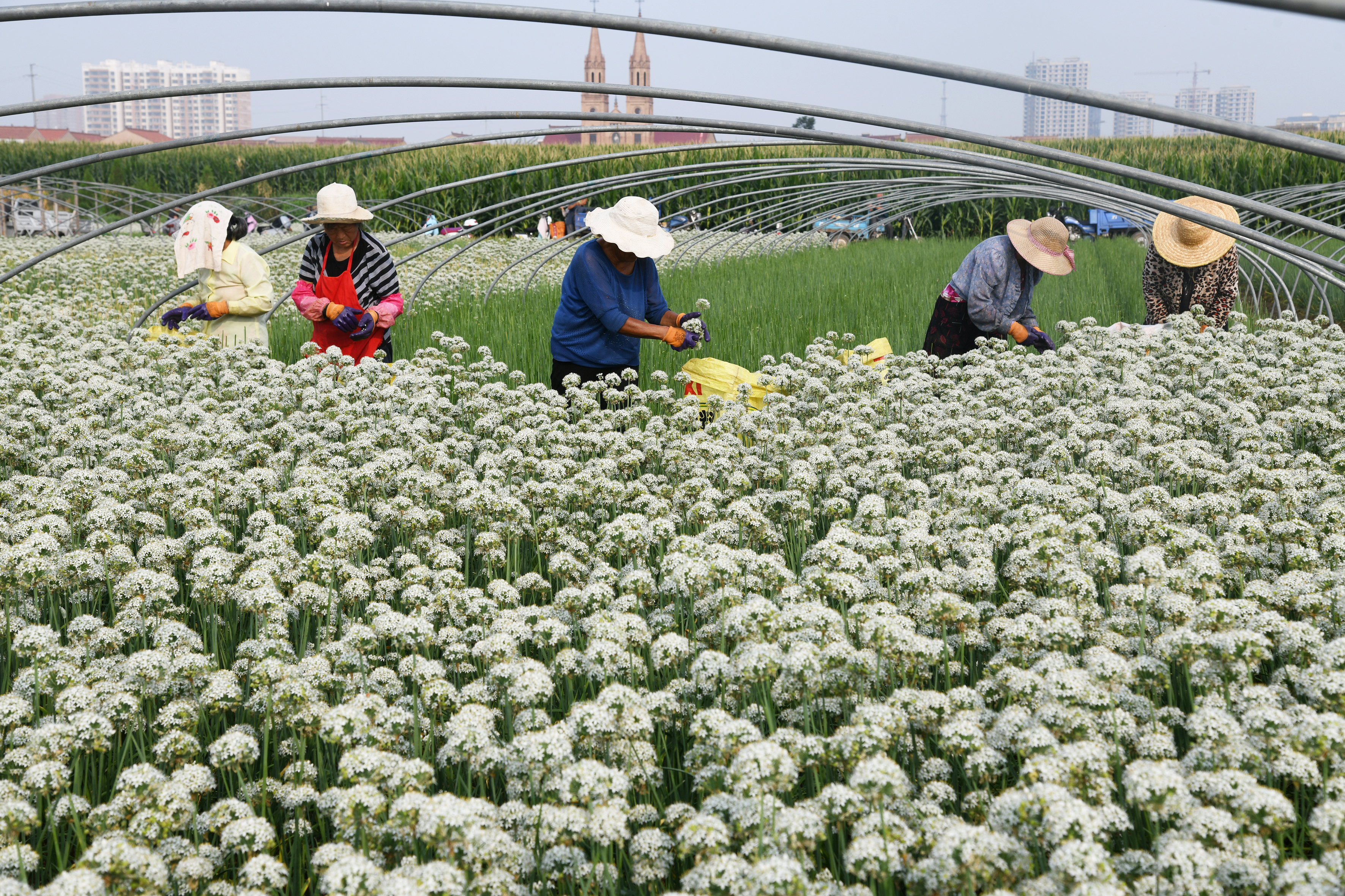 8月21日,闻喜县桐城镇东河口村村民在采摘韭花。