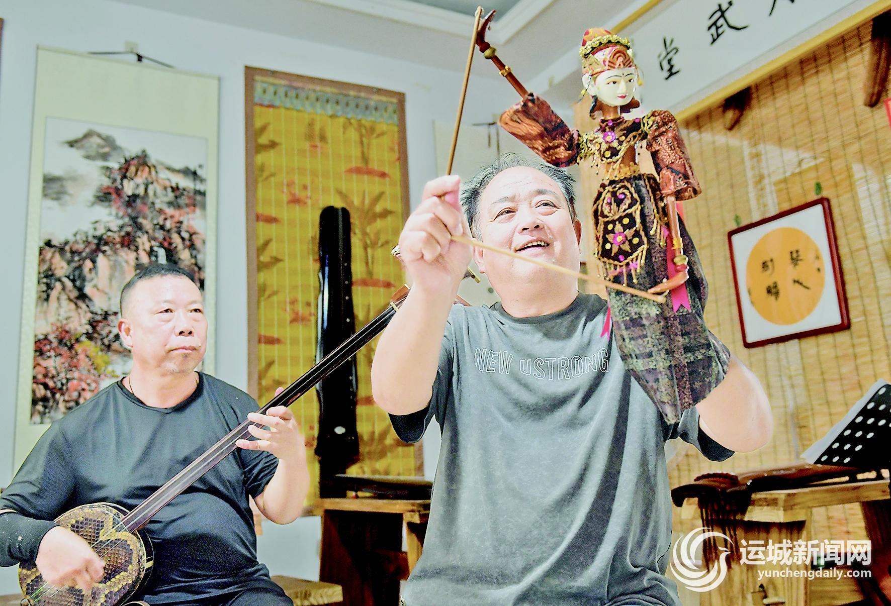 8月21日,芮城县古魏镇南关村,国家级非遗项目杖头木偶传承人尚文斌在排练线腔木偶戏《放饭》,为参加在平遥举办的“全省民间有高手”节目大赛作准备。