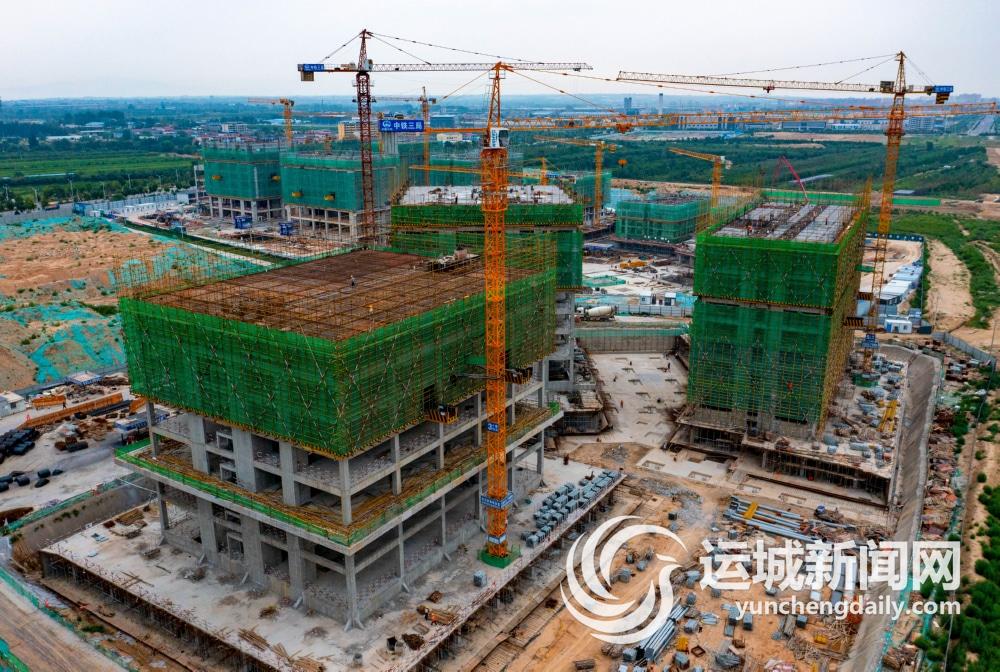 8月25日,黄河金三角(运城)创新生态聚集区科创城项目建设工地上,工人们在加紧施工。