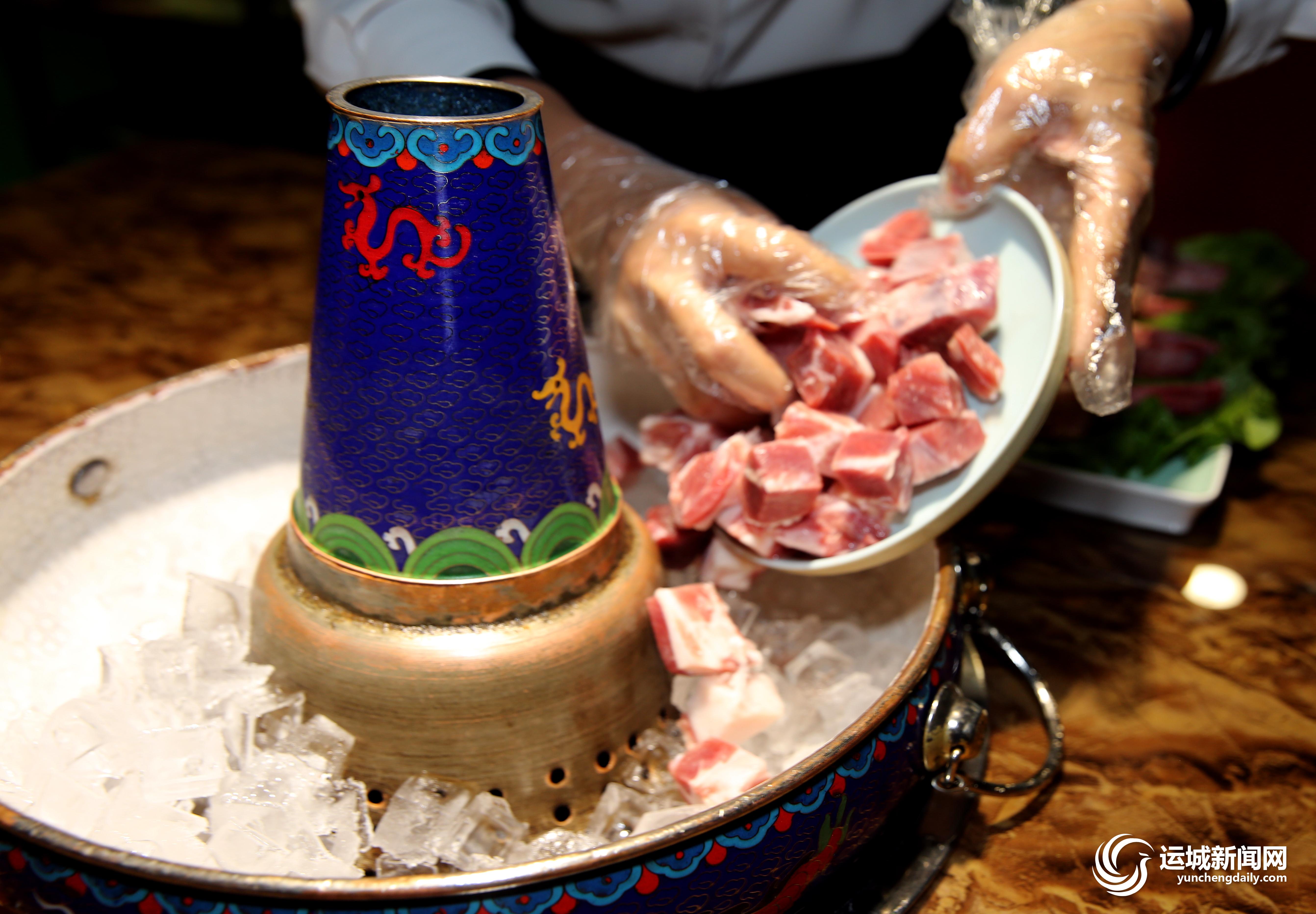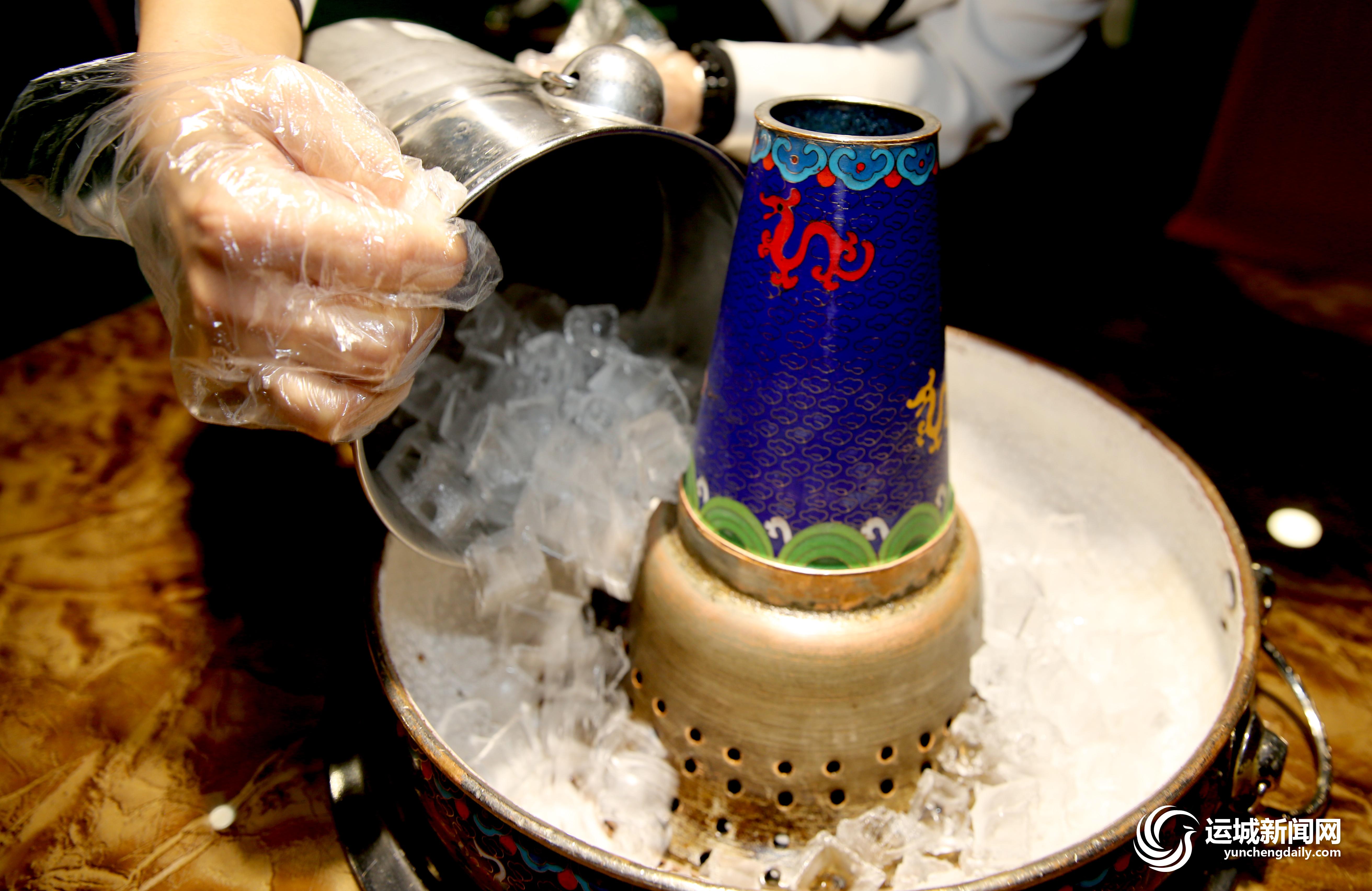 制作精良的景泰蓝铜火锅上桌,近百个小冰块置于火锅底,接着放入苏尼特羊肉块和羊排,再加入红酒、酸奶和秘制调料,最后倒入适量的农夫山泉水,然后盖上锅盖,开火。