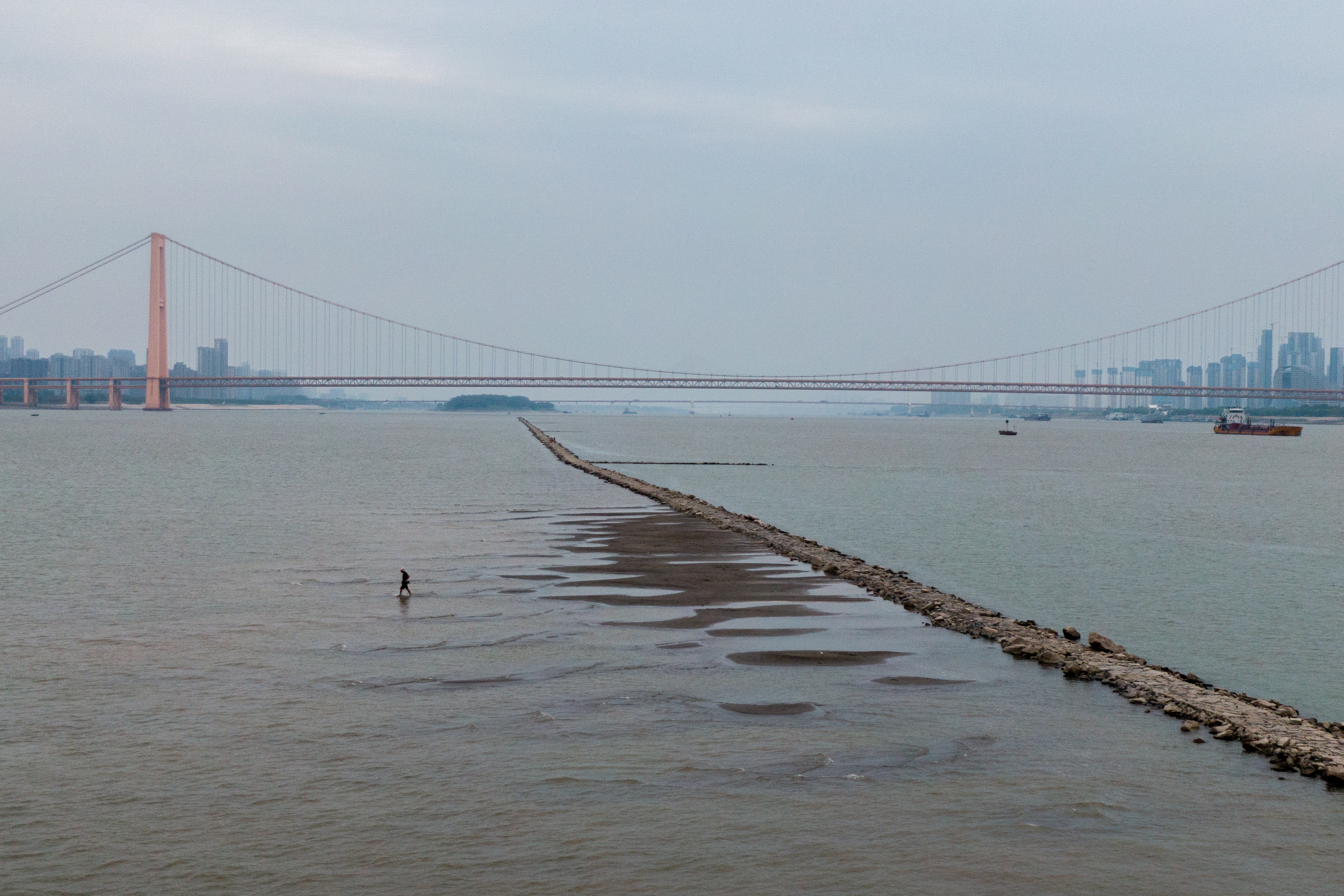 9月1日,长江武汉段露出一条江心小道(无人机照片)。