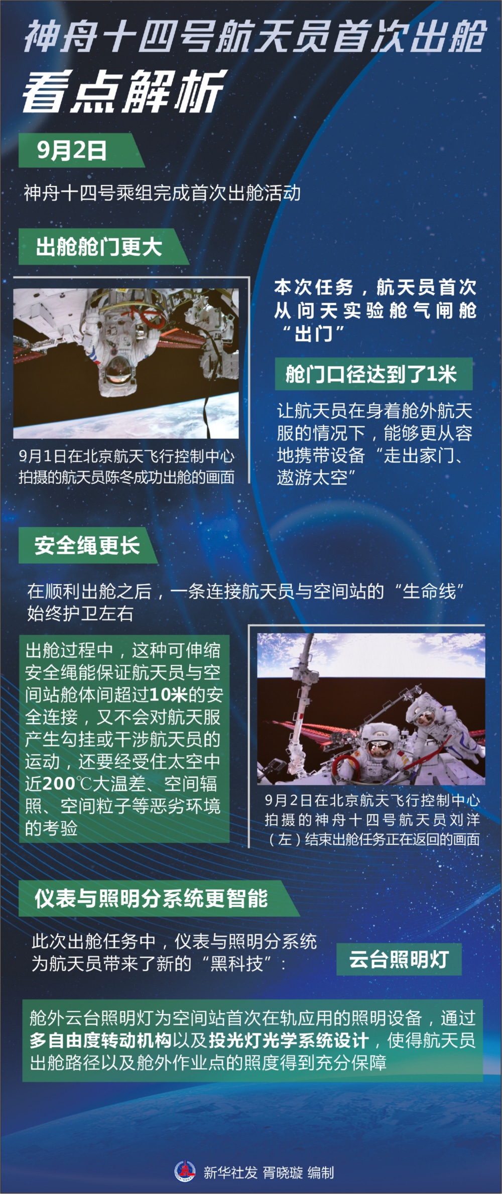 新华社北京9月2日电(记者 李国利 杨 欣)记者从中国载人航天工程办公室获悉,9月2日0时33分,经过约6小时的出舱活动,神舟十四号航天员陈冬、刘洋、蔡旭哲密切协同,完成出舱活动期间全部既定任务,陈冬、刘洋已安全返回问天实验舱,出舱活动取得圆满成功。