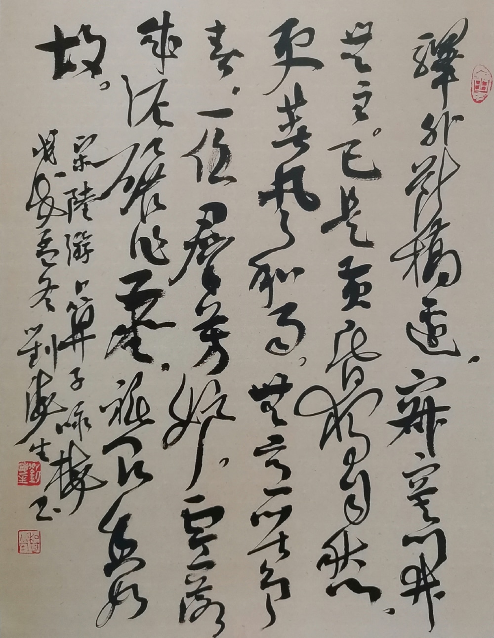 2006年,刘海生北上京城,拜师王镛等名家,后追魏碑、篆书,旁参张旭、怀素、徐渭,日夜临池不倦,汲各家所长,得之古法用笔、章法变化,极为丰富,于此方渐入佳境——弛之有度、行之有速、张之有衡、变之有法、狂之有道。