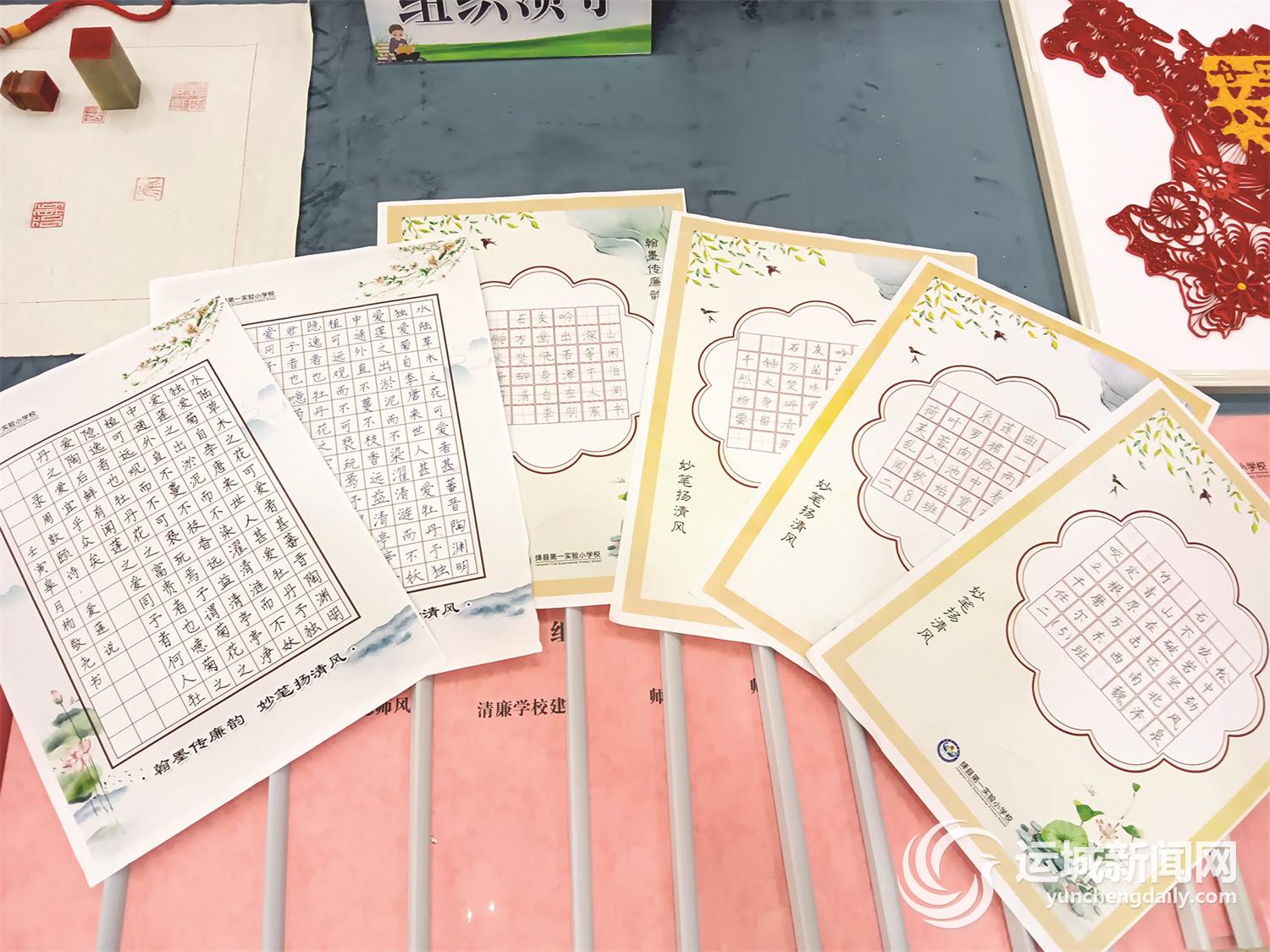 “斯是陋室,惟吾德馨”“莲,花之君子者也”,教师的书法作品刚劲有力;“中国梦”“公生明,廉生威”等手工衍纸作品振奋人心;“廉”“两袖清风”“四个自信”……6年级10班徐涵伊小朋友自主创作的廉洁篆刻作品也有模有样。