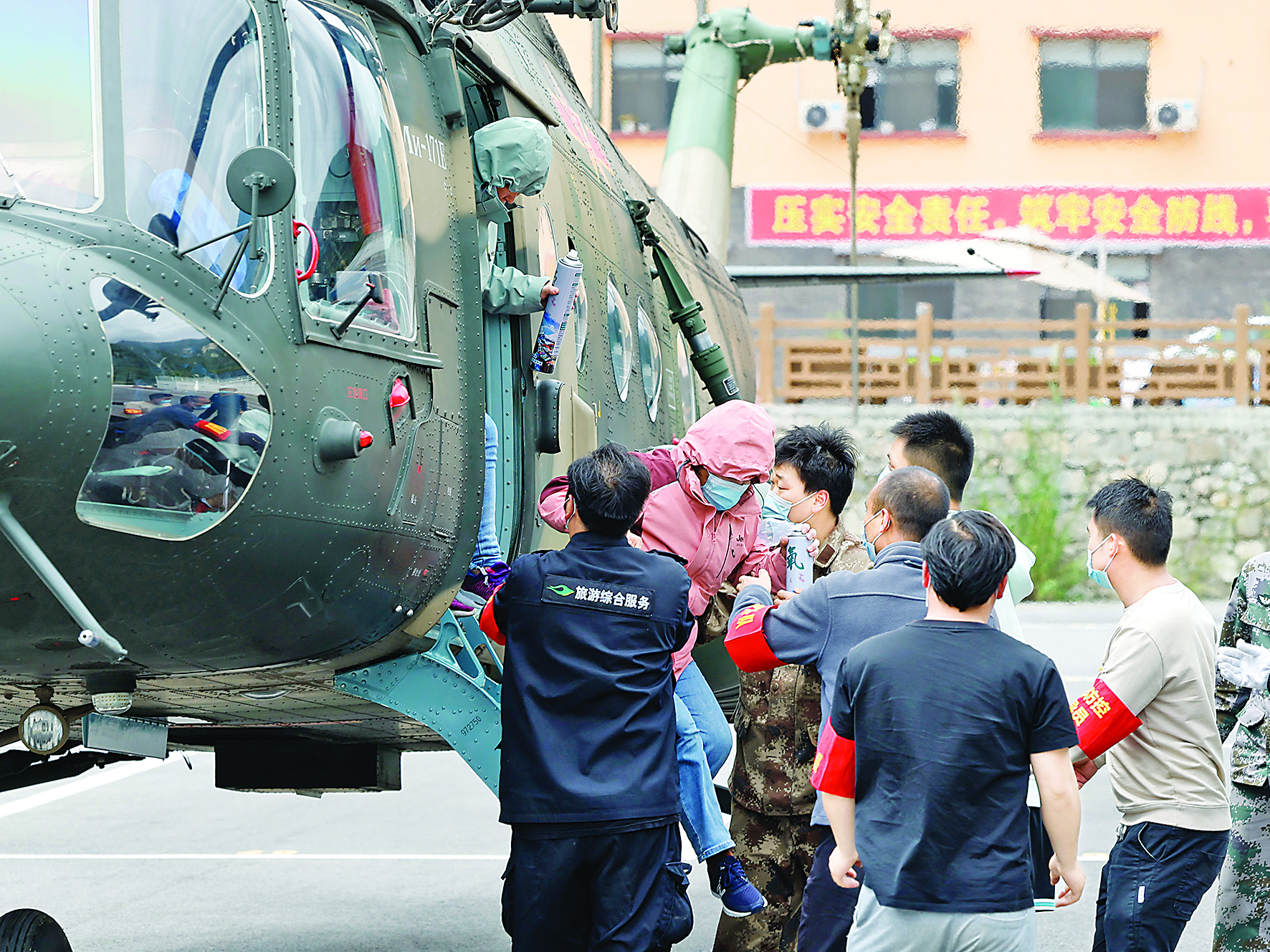 ▲9月7日,首批从海螺沟搭乘直升机疏散出来的滞留人员抵达泸定县磨西镇。当日,从四川省海螺沟景区疏散的200余名当地群众、游客和工作人员等搭乘直升机抵达四川省甘孜州泸定县磨西镇。 新华社记者 沈伯韩 摄