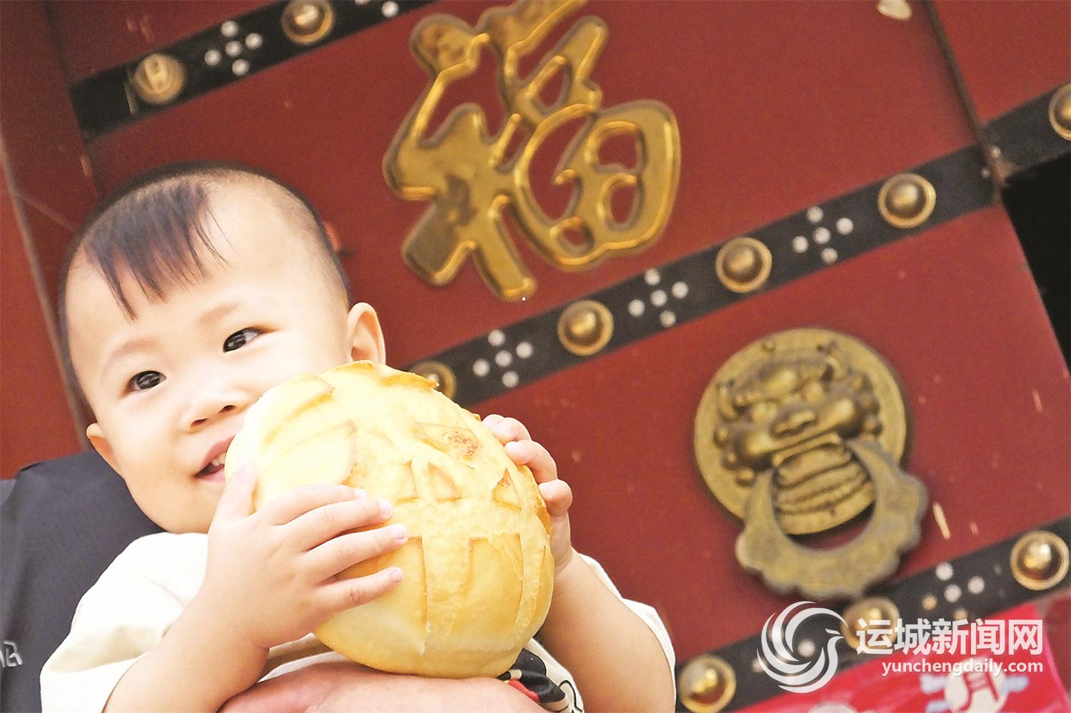 9月8日,新绛县泽掌镇泽掌村的小朋友抱着花馍爱不释手。
