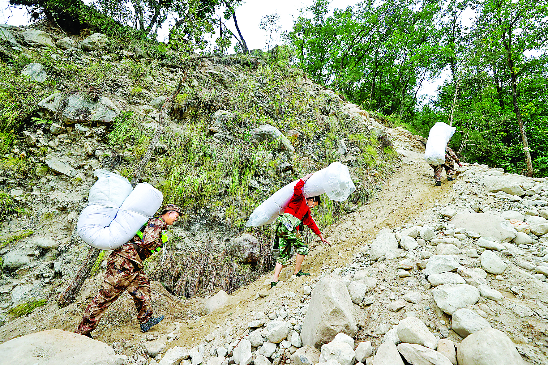 四川泸定地震发生后,震中磨西镇附近一些居住在山上的村民,因道路损毁未能全部撤出,只能在相对安全的开阔地带搭建临时安置帐篷。救援人员和志愿者沿着临时架设的过河小桥和开辟出的上山小路,通过肩背人扛,把饮用水、帐篷等物资送上山,为山上临时安置居民建立了一条供给线。