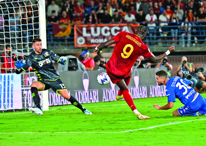 9月12日,罗马队球员亚伯拉罕(中)在比赛中射门得分。 当日,在2022~2023赛季意大利足球甲级联赛第六轮比赛中,罗马队客场以2比1战胜恩波利队。