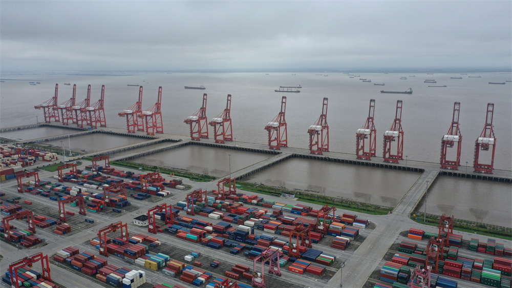9月14日,江苏省太仓港集装箱码头停止作业,39台岸桥大臂全部收起(无人机照片)。