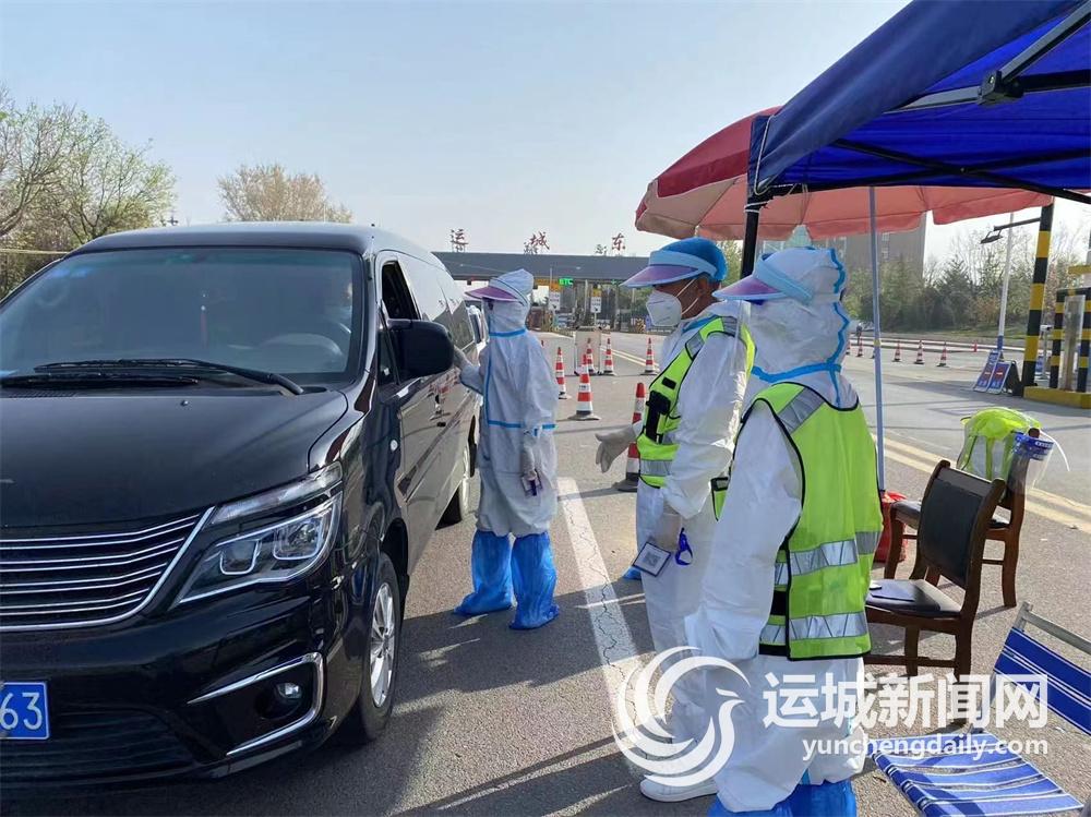 郝津阳(左一)在运城东高速口对入运人员查码(资料图片)