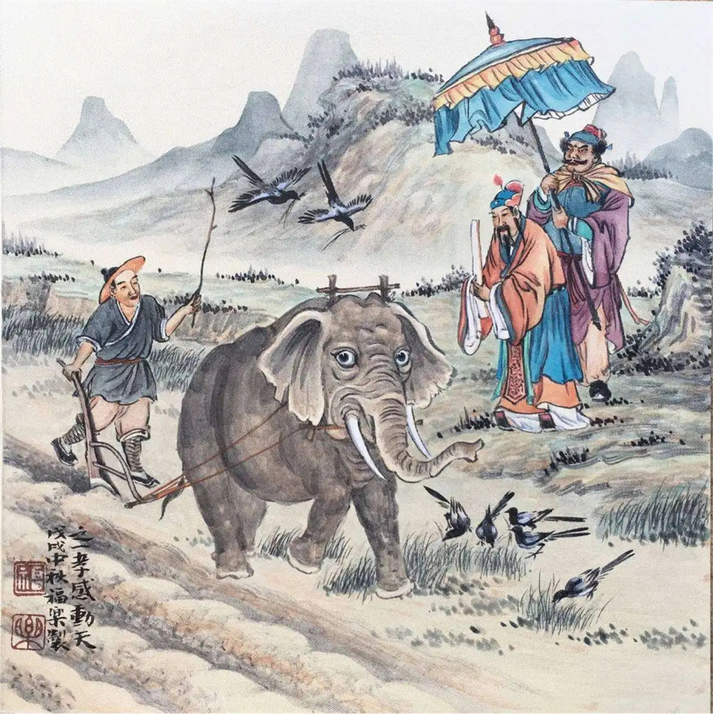 《孟子·离娄章句下》“舜生于诸冯,迁于负夏,卒于鸣条,东夷之人也。”舜,虞舜。姓姚,名重华,河东永济人。传说舜的生母去世早,继母经常虐待舜,甚至常唆使丈夫(瞽叟)和亲生儿子(象)加害于舜,但舜命大,屡次逃脱了死亡厄运,且不记恨,依旧孝敬父母,关爱弟妹。舜在历山耕作期间,仍旧不违孝道,大地鸟兽皆为之感动,便有“象可代其耕,鸟可代其耘”之说。