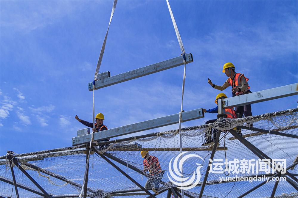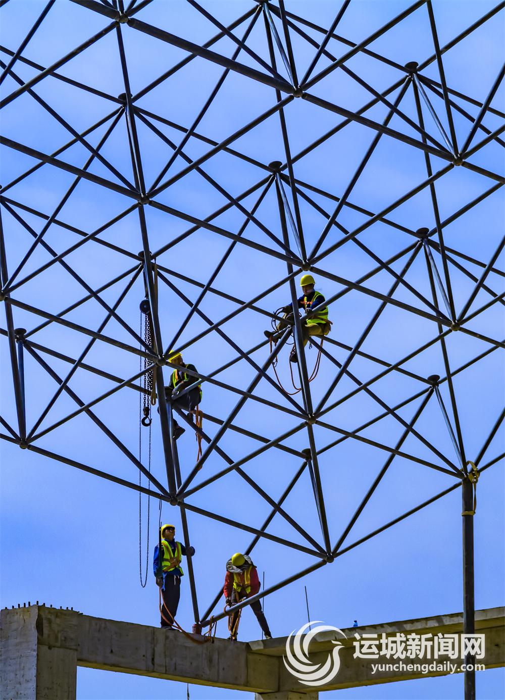 9月23日,运城建工集团的工人在运城市会展中心项目施工现场搭建主体外部结构。总建筑面积8.2万平方米的会展中心是运城市重点项目之一。项目自2021年3月开工以来,平均每天有400余名建筑工人参与施工,昼夜奋战在施工一线,目前已完成总工程量的50%。