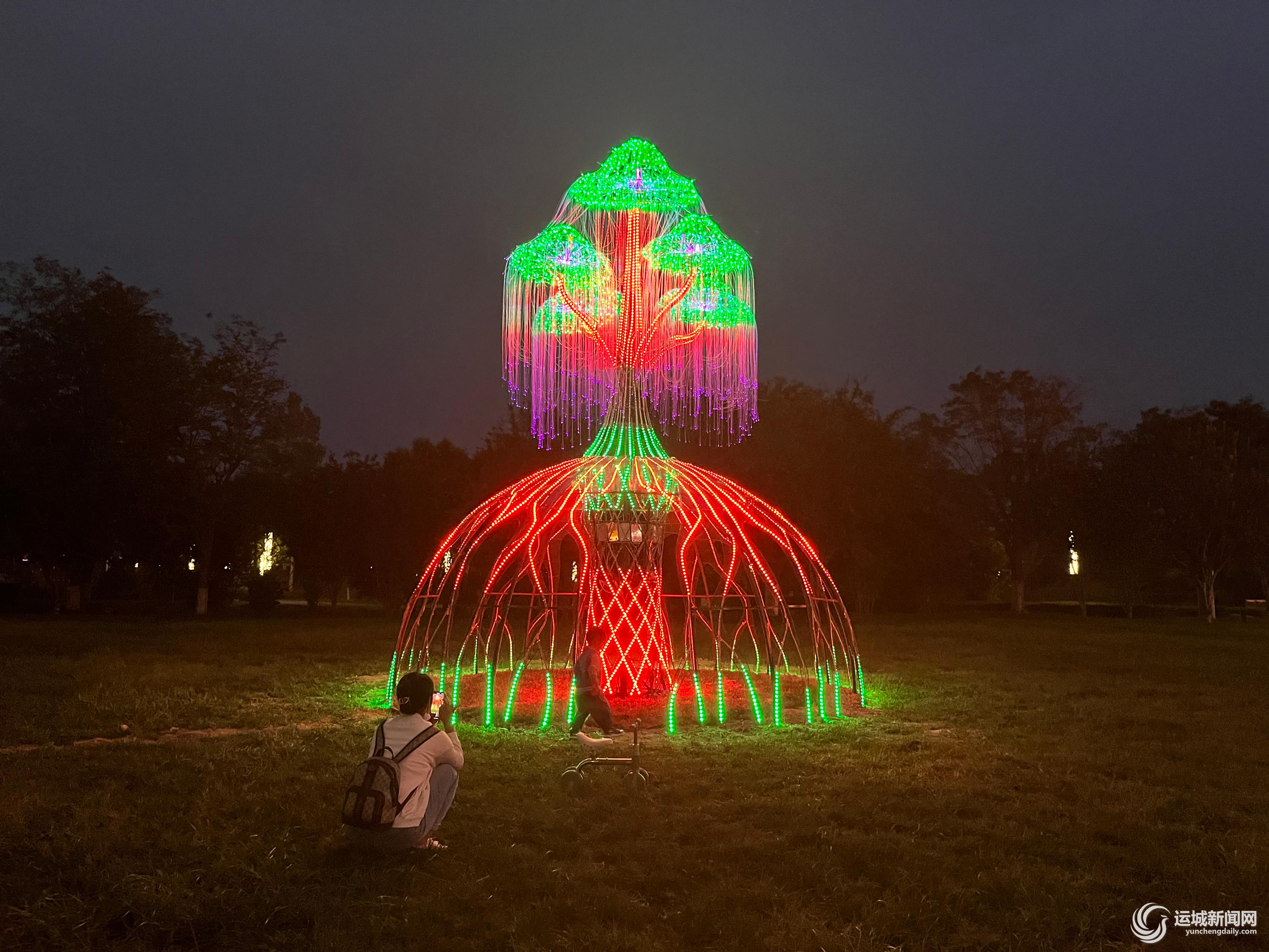 一路往前,灯光小品、发光地砖、发光水母、高杆灯等设施,照亮了市民的游园之路。