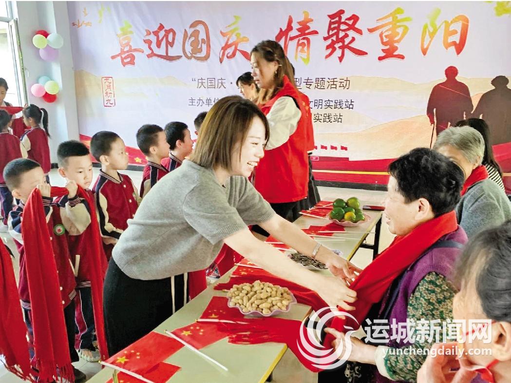 运城晚报讯(记者 范楚乔)9月28日,盐湖区东城街道中银街社区新时代文明实践站、金鑫社区新时代文明实践站共同举办“庆国庆·贺重阳”活动,共庆祖国华诞,向老年人提前送上重阳节的祝福(上图)。