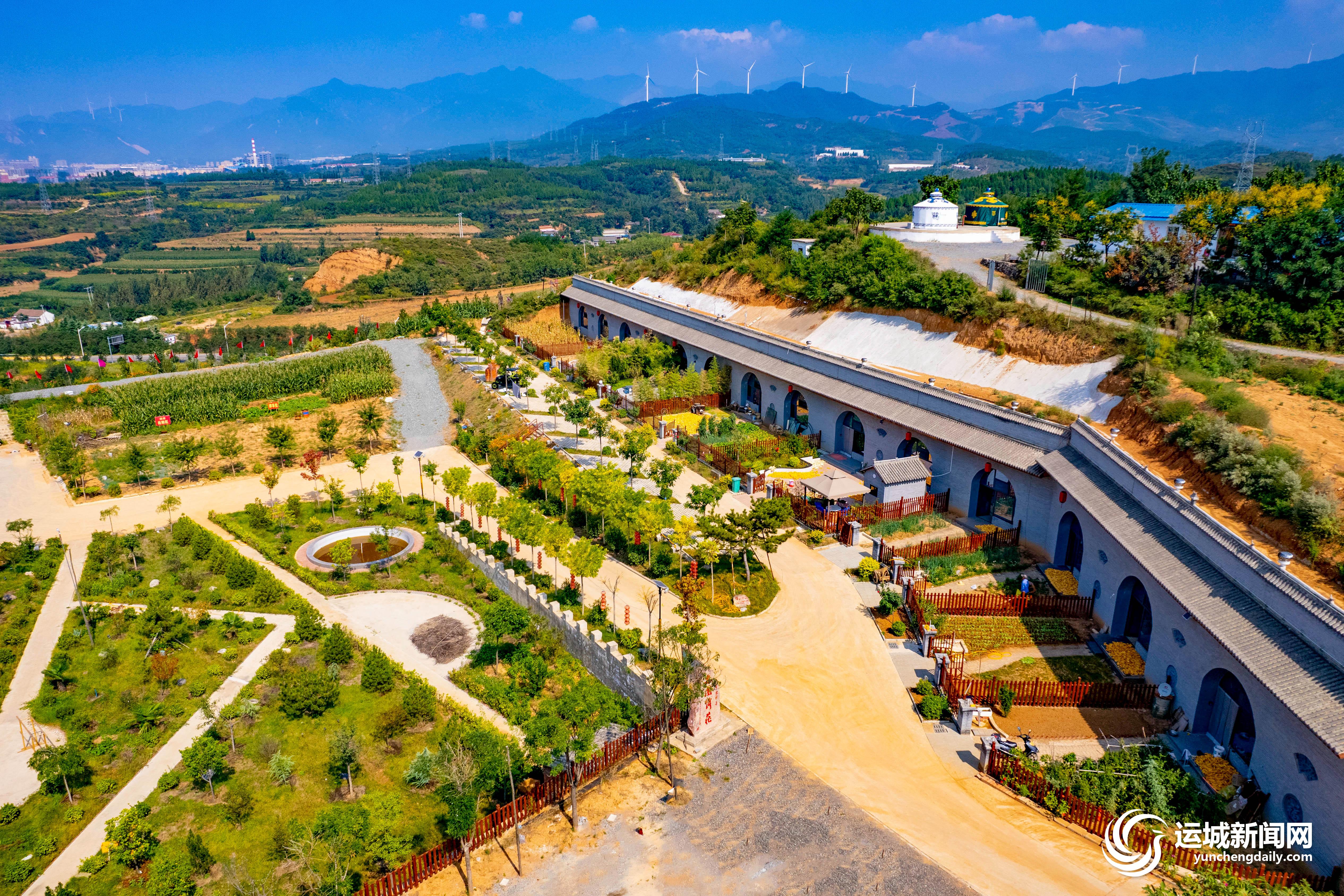 “有啥特色农家菜?”刚到桃源仙庄,赵为民和工作人员鲁爱荣先确定菜单。二人站在一排现代化窑洞前,别有一番景致。就在赵为民点菜的同时,他的家人开始在仙庄里闲逛,在窑洞民宿前拍照留念,漫步在野花丛中,坐在栈道栏杆上休息……要是顺着小路再往高处走,在一片玉米地旁,可以俯瞰一片桃林和一条平整的公路,遥望县城城区和四周山脉起伏的轮廓。山风拂过,可以看见在蓝天下缓缓转动的洁白“风车”。