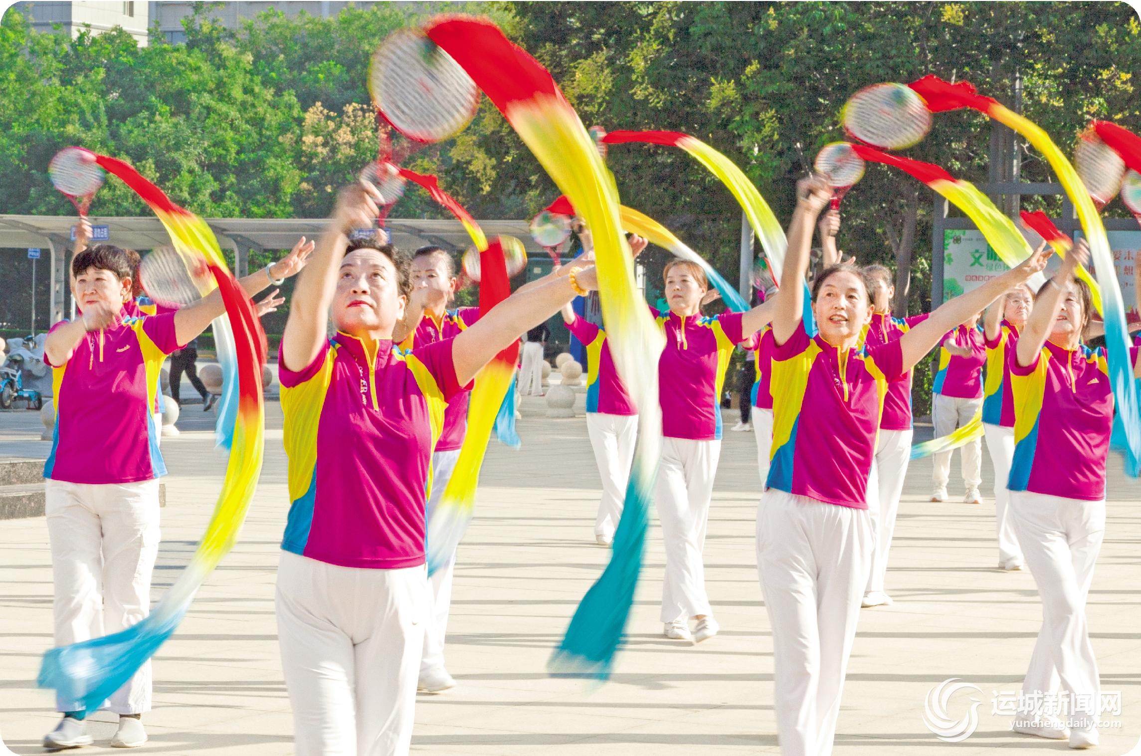 9月28日,盐湖区柔力球协会群星柔力球队的队员们在市体育馆前表演长绸柔力球。