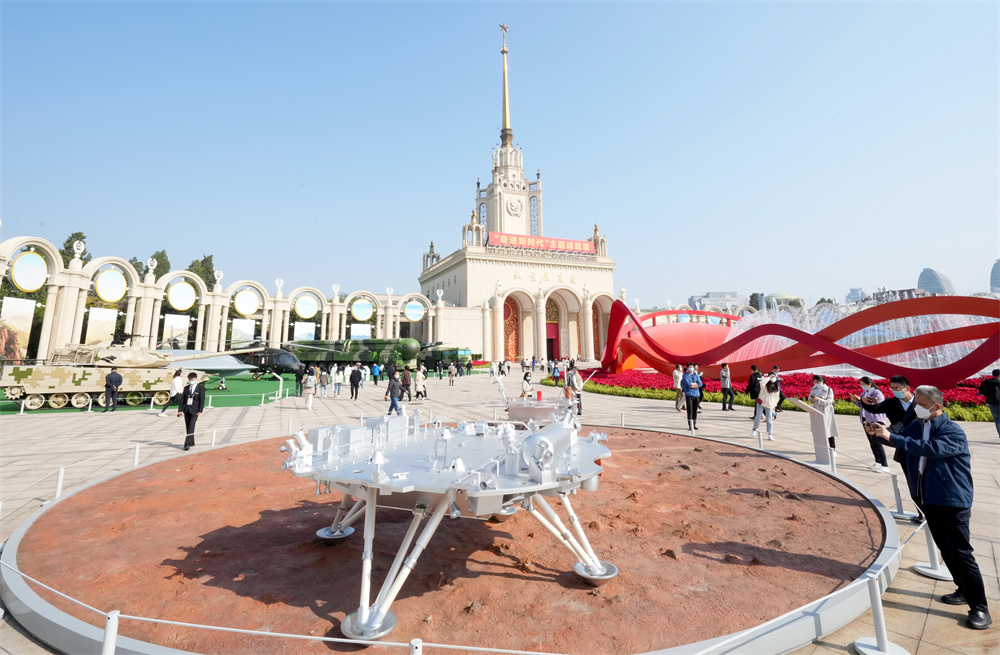 10月7日,观众在北京展览馆“奋进新时代”主题成就展上参观天问一号着陆器模型。
