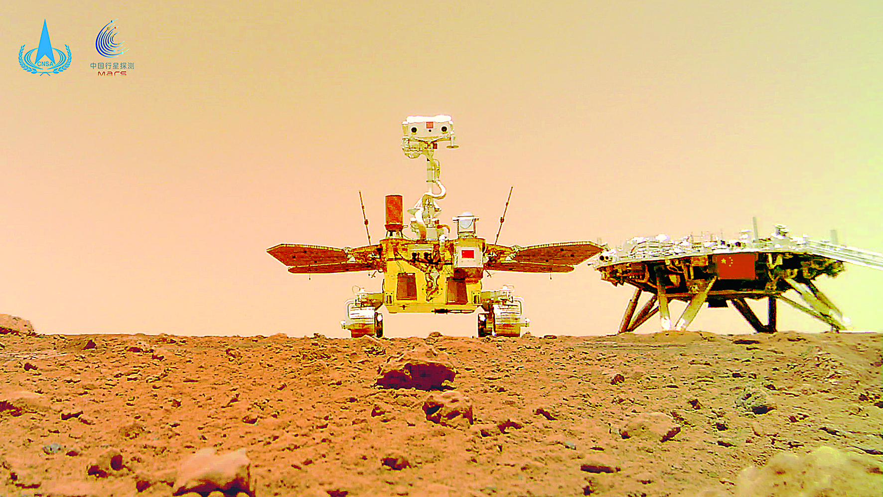 ▲这是“着巡合影”图。2021年6月11日,国家航天局在北京举行天问一号探测器着陆火星首批科学影像图揭幕仪式,公布了由祝融号火星车拍摄的着陆点全景、火星地形地貌、“中国印迹”和“着巡合影”等影像图。首批科学影像图的发布,标志着我国首次火星探测任务取得圆满成功。 新华社发