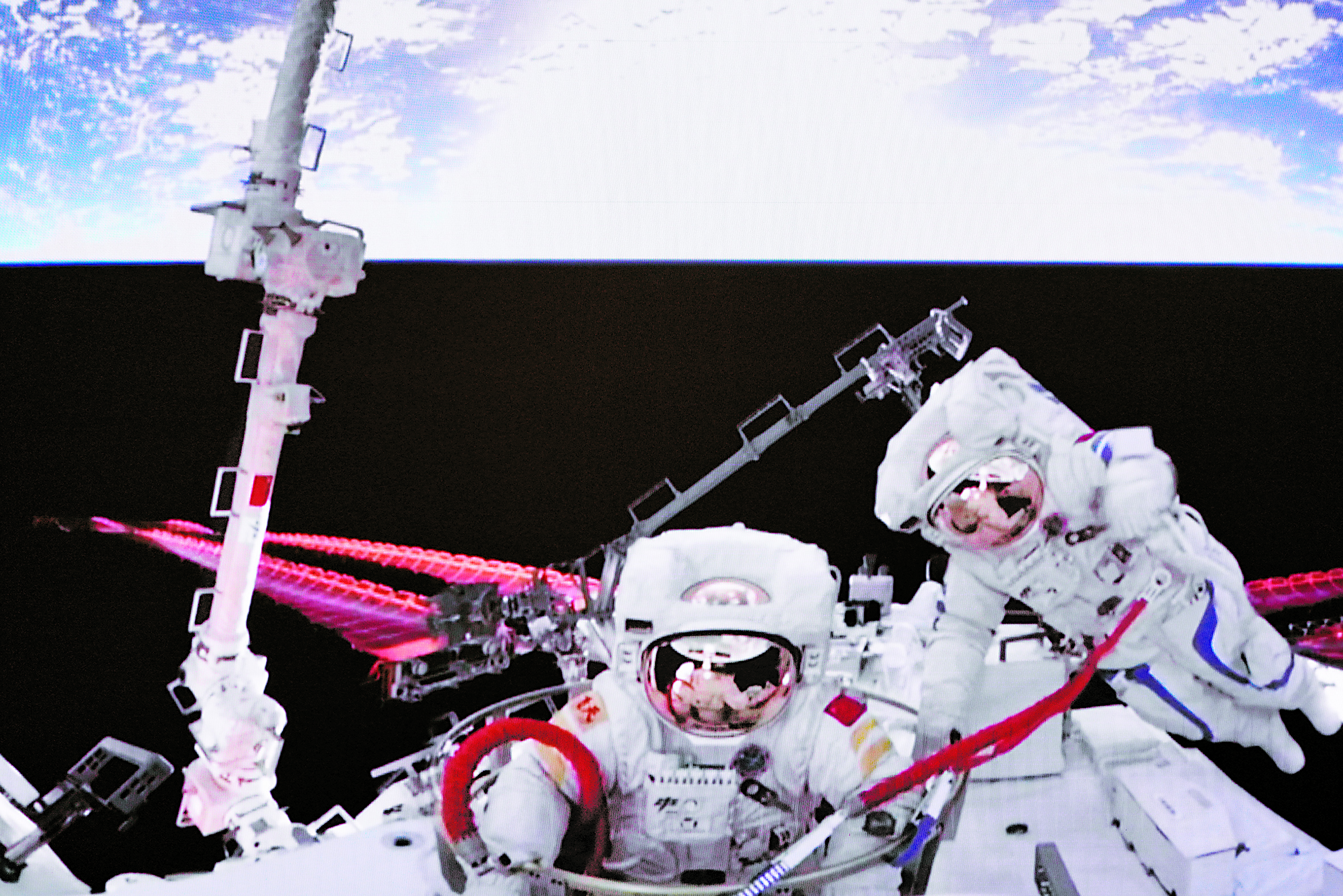 ▲2022年9月2日在北京航天飞行控制中心拍摄的神舟十四号航天员刘洋(左)结束出舱任务正在返回的画面。 新华社发