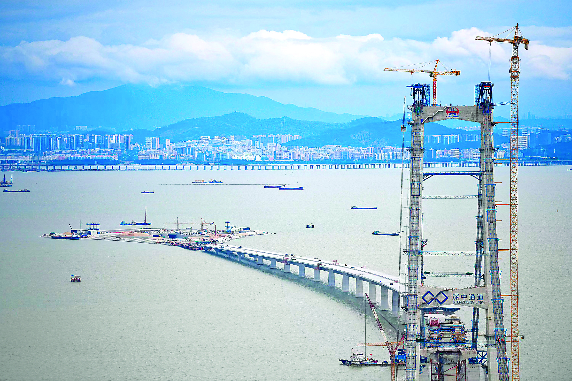 ▲深中通道伶仃洋大桥东塔、西人工岛及远处的深圳市区(2022年6月7日摄)。 新华社记者 邓华 摄