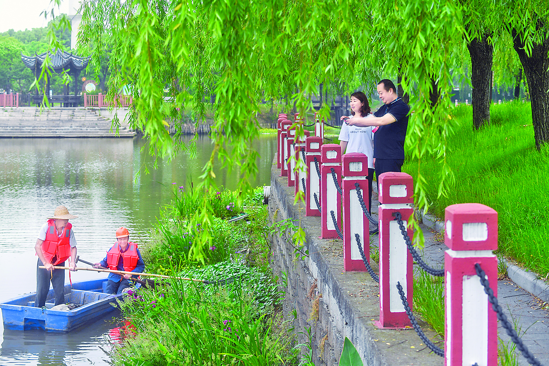 ▲在浙江省湖州市吴兴区东林镇泉益村,镇人大代表和河长(右)在巡查河道(2021年5月8日摄)。