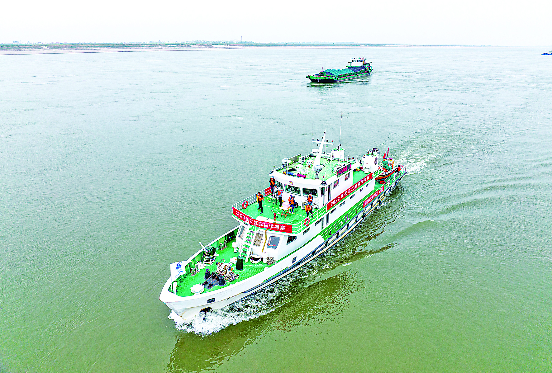 ▲长江江豚科学考察船在湖北监利段水域行驶(2022年9月24日摄)。