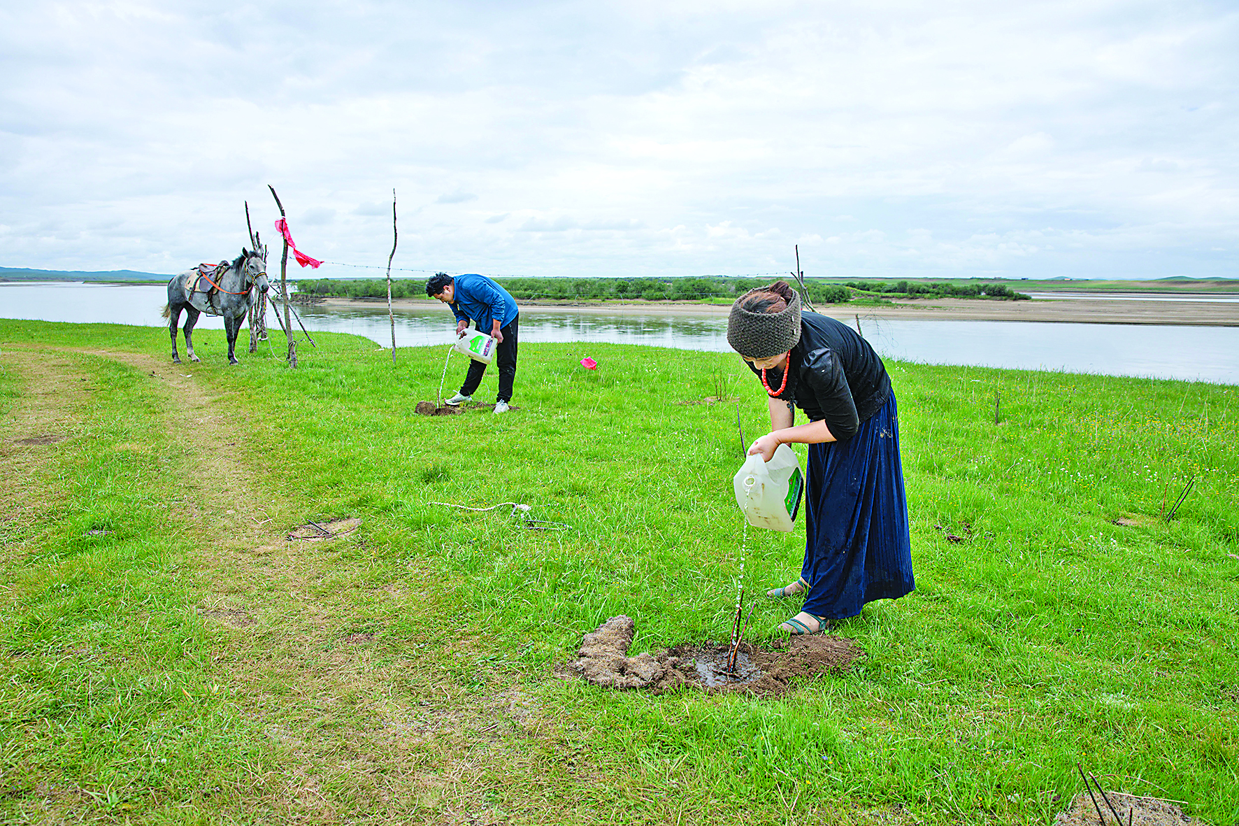 ▲四川省若尔盖县麦溪乡嘎沙村巡河队的村民在黄河边给新种的柳树浇水(2022年7月26日摄)。 新华社记者 江宏景 摄