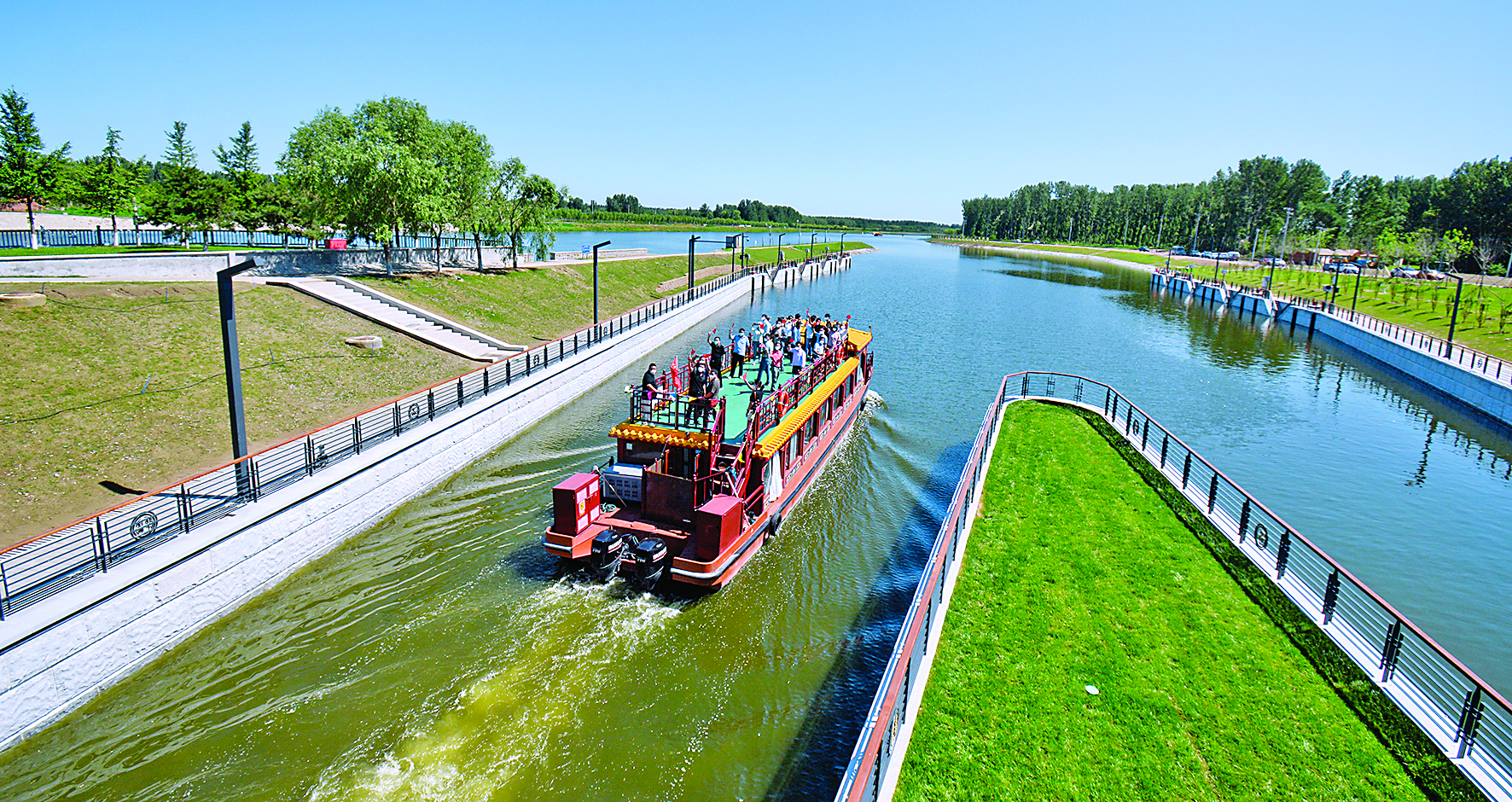 ▲2022年6月24日,京杭大运河京冀段全线62公里实现游船通航。这是载着北京游客和建设者代表的游船通过船闸进入京杭大运河河北段。 新华社记者 李欣 摄