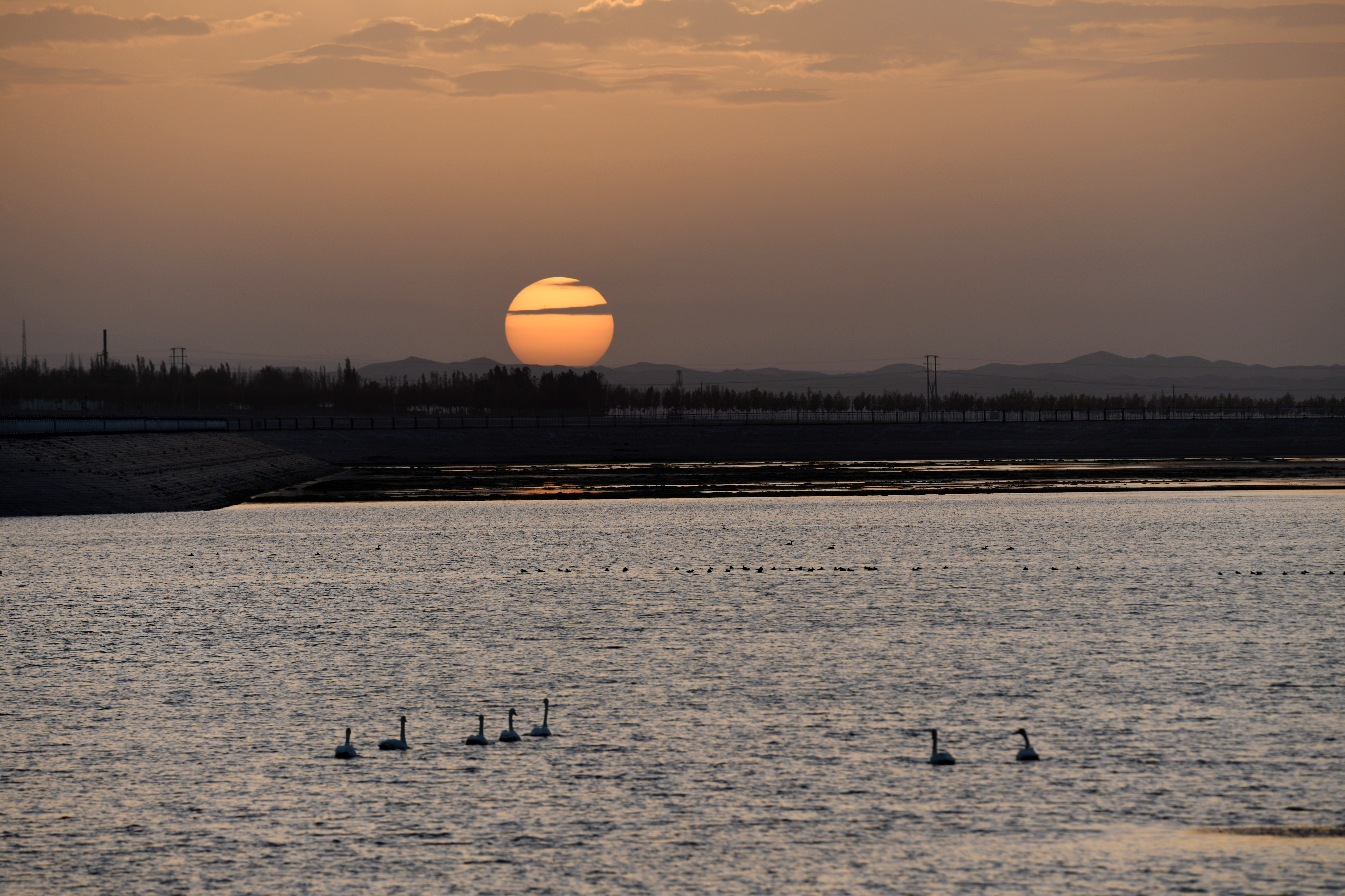 10月5日日落时分,在甘肃省阿克塞哈萨克族自治县的冬不拉水库,天鹅和野鸭在湖中戏水。
