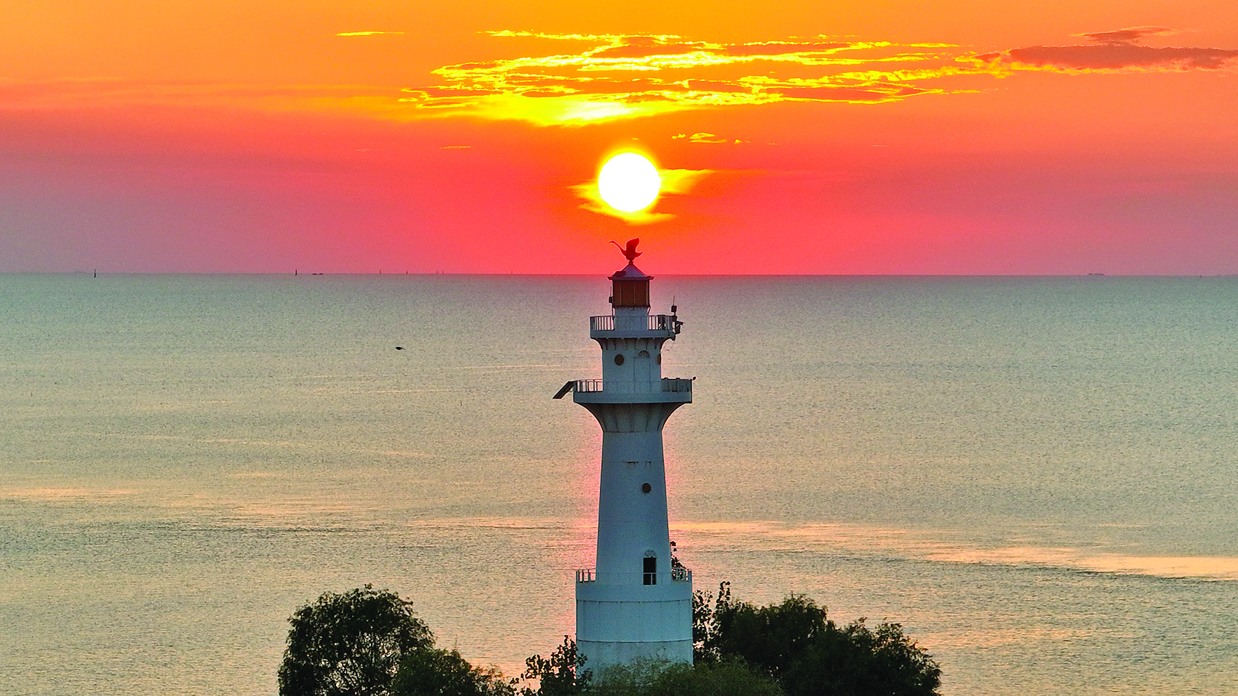 9月26日在江苏省淮安市拍摄的夕阳下的洪泽湖和灯塔