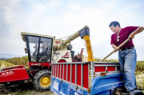 金秋好时节,玉米收获时。9月24日,灵宝市西阎乡黄河岸边,一辆轰鸣的收割机在玉米地里穿梭,一穗穗玉米顷刻间变成金黄色的颗粒,一行行玉米秸秆粉碎洒落在田野,农民朋友喜出望外,一派丰收景象。据悉,我市头茬玉米收获已近尾声,回茬玉米大面积成熟还需半月左右。初步预计,今年秋季又是个丰收季。 记者 杜杰 摄