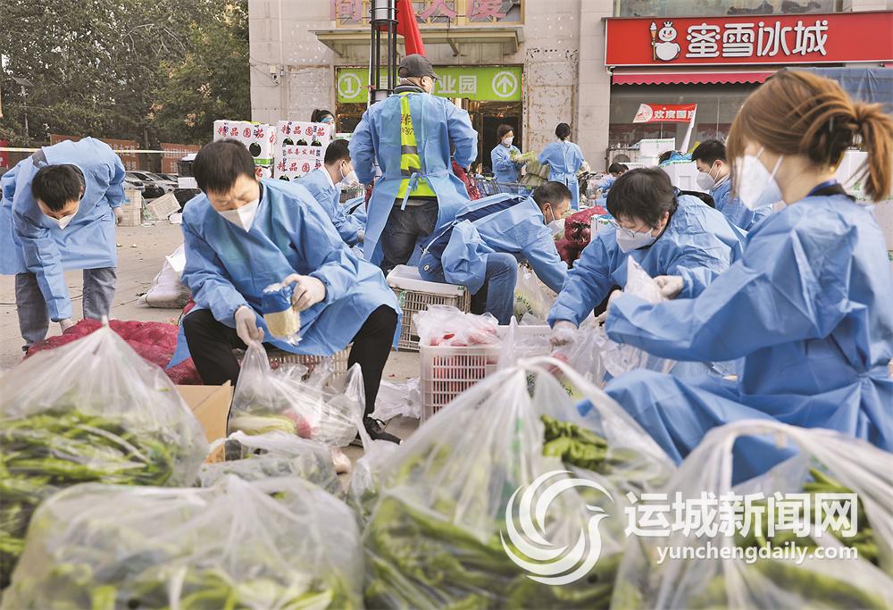 10月17日,在市区人民北路万荣易家生鲜超市星河店,爱心志愿者同超市工作人员一起紧张有序地为市民准备蔬菜包。