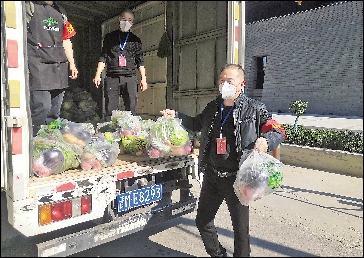 居民生活物资转运和分发是下沉干部承担的一项重要工作。保供车辆到来之后,党员干部们便主动引导车辆驶入指定位置,第一时间配合社区将蔬菜、米面油等生活物资搬运至储物间或三轮车上,经过消毒后按照订单送至住户门前,为居民安心居家提供了保障。
