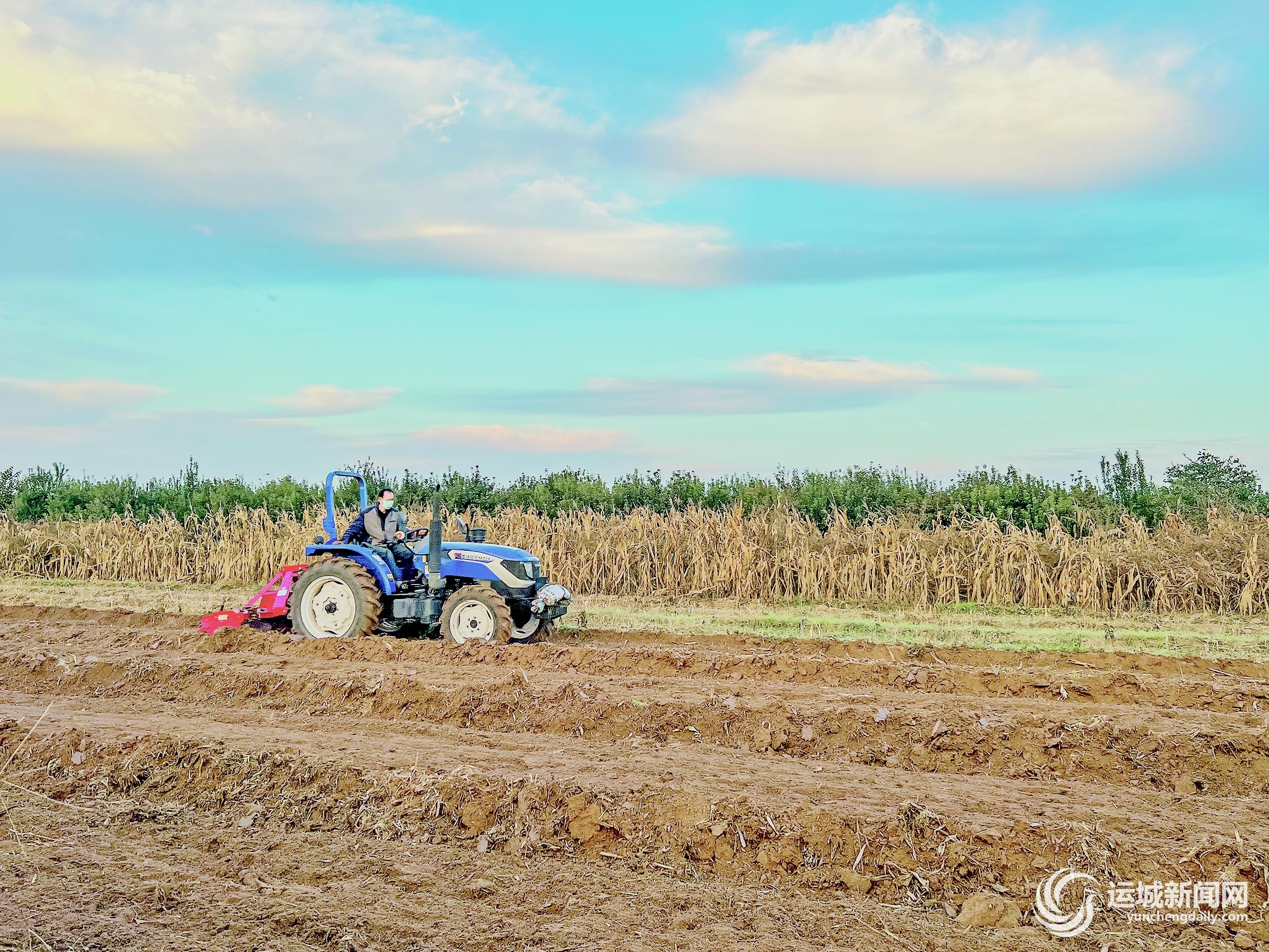10月20日,万荣县裴庄镇太和村村民在旋耕玉米地,为复播小麦作准备。