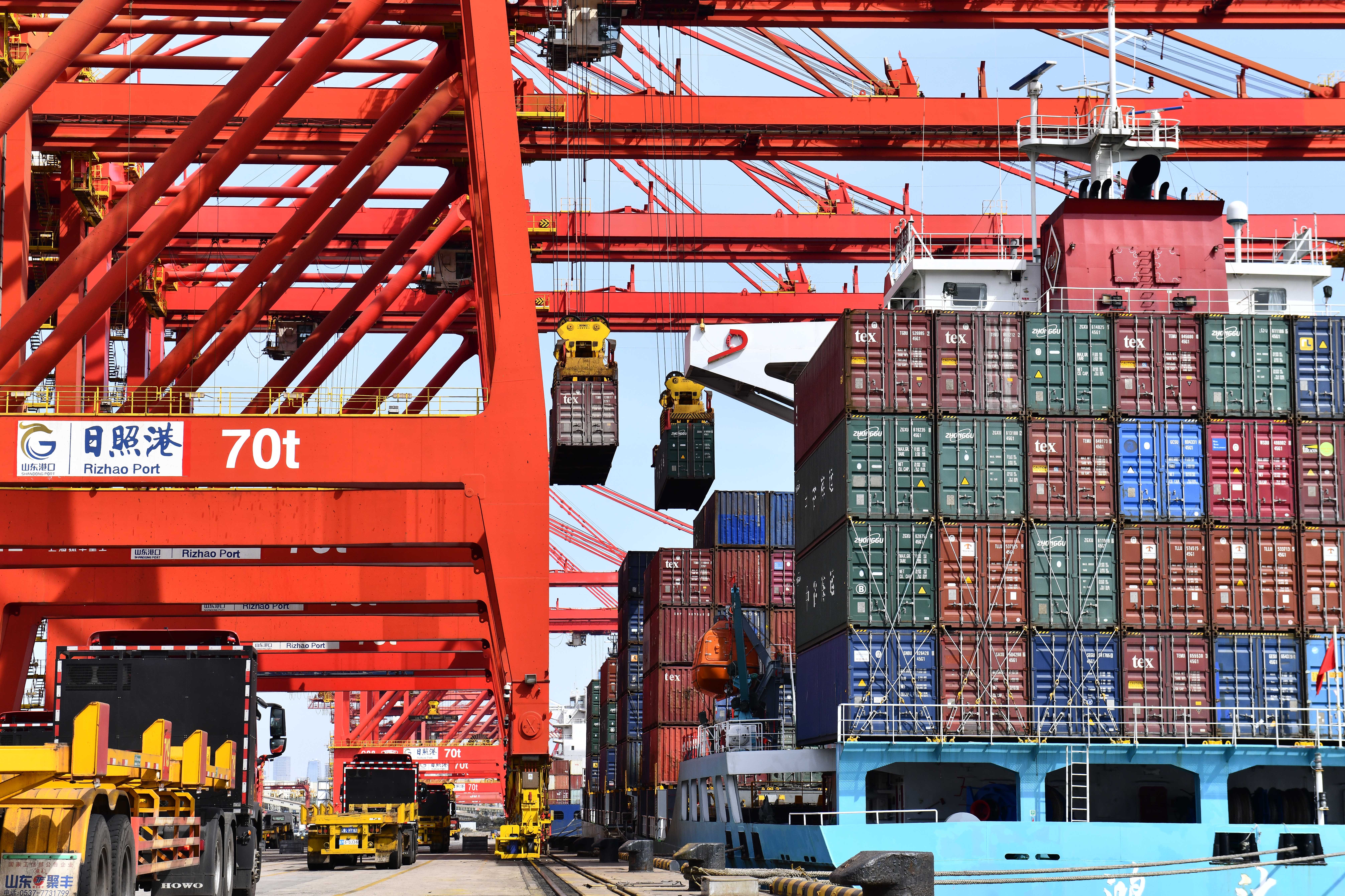 卡车在山东日照港集装箱码头装运集装箱(3月28日摄)。