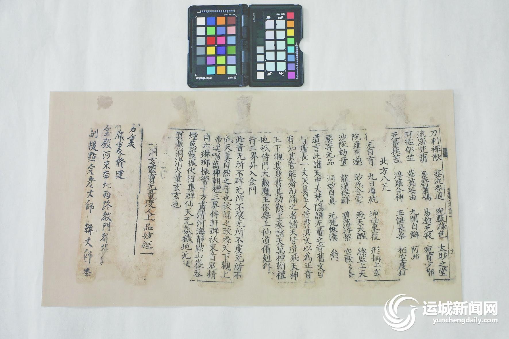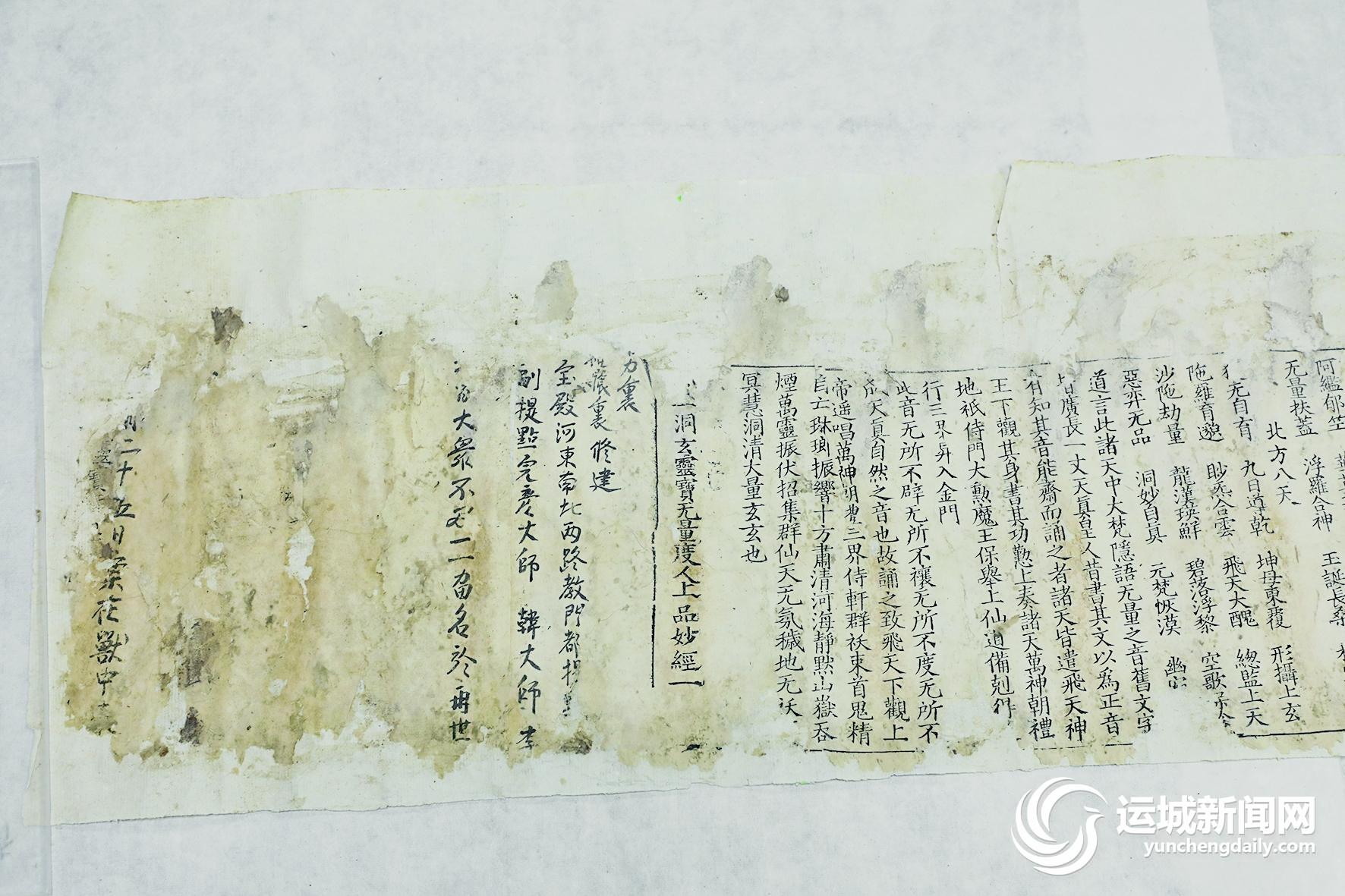 2019年6月,永乐宫壁画保护研究院在开展永乐宫搬迁资料整理工作时,发现近百件与永乐宫宗教活动有关的古籍文书。其中,6件元朝道教度戒牒文书和1件或早于同期的刻印道经,弥足珍贵,对研究元朝全真教发展和永乐宫重建历史具有重要价值。经有关专家评估,被定为馆藏一级文物。在南京博物院的帮助下,这些珍贵文物得以修复。