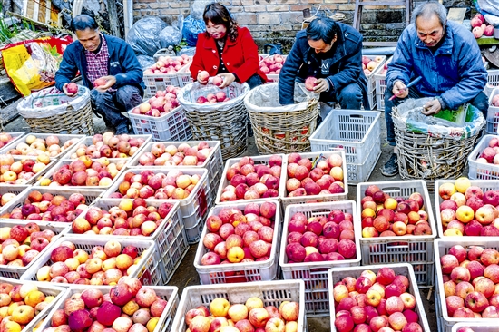 初冬季节,我市优质苹果核心产区灵宝市寺河乡种植的苹果陆续收获。走进该乡的南埝村,扑面而来的是沁人心脾的苹果清香,每家院落里都堆满了红彤彤的苹果,果农忙着搬运、分级、包装苹果,供应市场。据悉,该村海拔1280米,是名副其实的亚洲第一高山果园。图为11月9日,该村果农正忙着把收获的苹果分拣装筐。 记者 杜杰 顾新风 摄