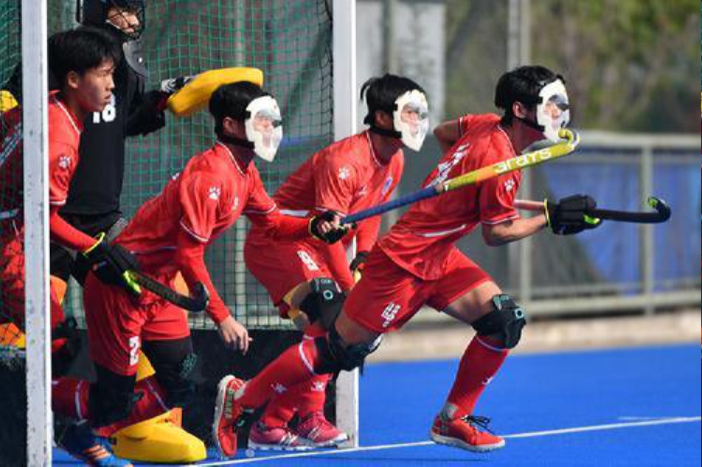 ▲11月15日,天津队球员姜雷(右一)与队友防守北京队发短角球。 当日,在江苏常州举行的2022年全国青年男子曲棍球锦标赛第一阶段第三轮比赛中,北京队以9.5比1战胜天津队。 新华社发(史康 摄)
