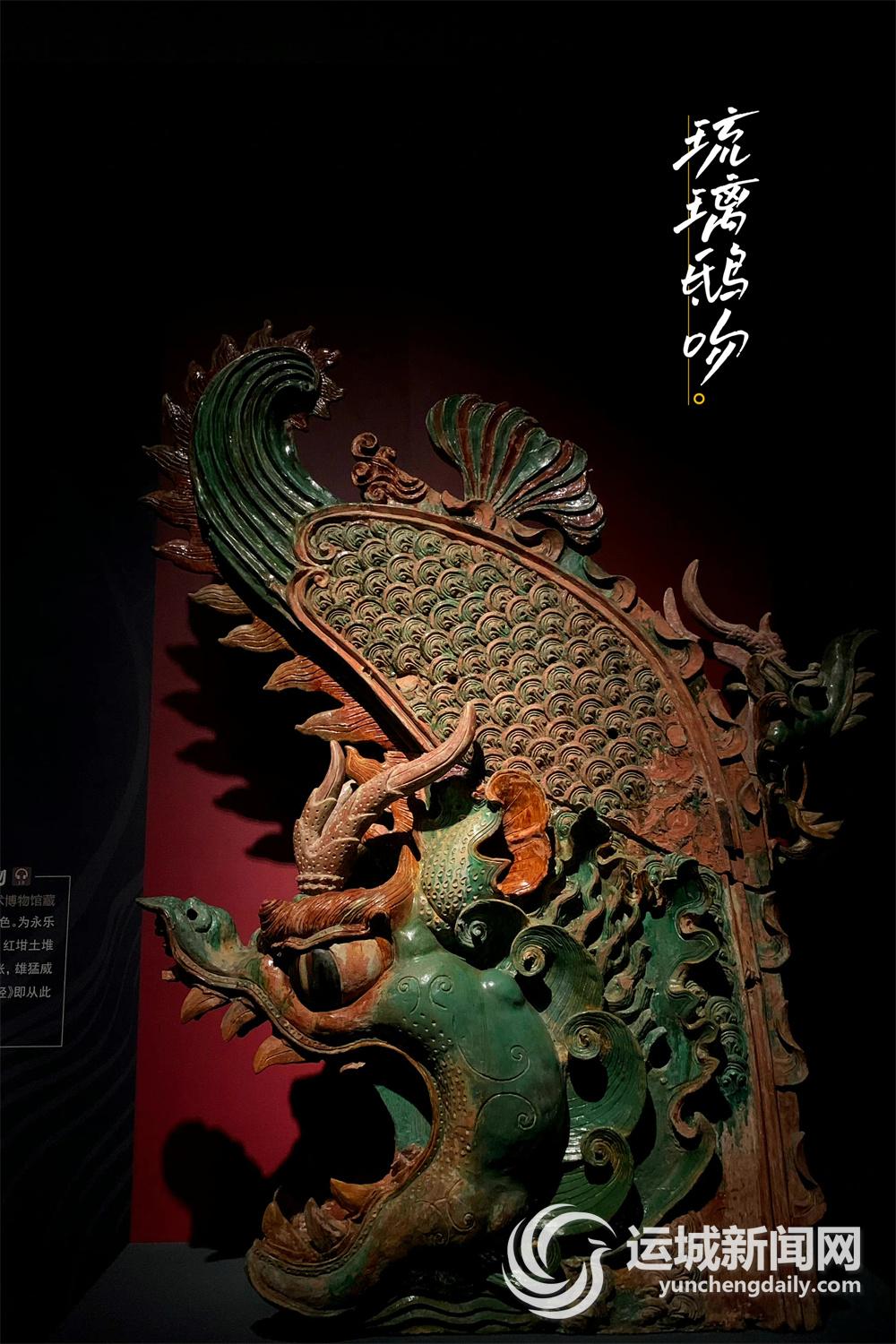 除此之外,中运博的场馆空间为完整展示“三清殿琉璃鸱吻及正脊”提供了便利条件。三清殿琉璃鸱吻及正脊是一套首次展出的、完整的三清殿屋檐顶端的琉璃构件,其华美之势创后世堆花脊筒之先河。这套琉璃构件长17米、高3米,鸱吻的整体造型为巨龙盘曲式,红泥作胎,孔雀蓝釉色,鸱吻张口吞脊,怒目圆睁,炯炯有神,脊身花束艳丽,釉面斑驳,釉色以黄、绿、蓝三彩为主,观众可以360°环绕式近距离观看这件元代琉璃上品。
