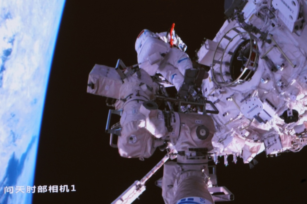 11月17日在北京航天飞行控制中心拍摄的航天员陈冬成功出舱的画面 新华社发