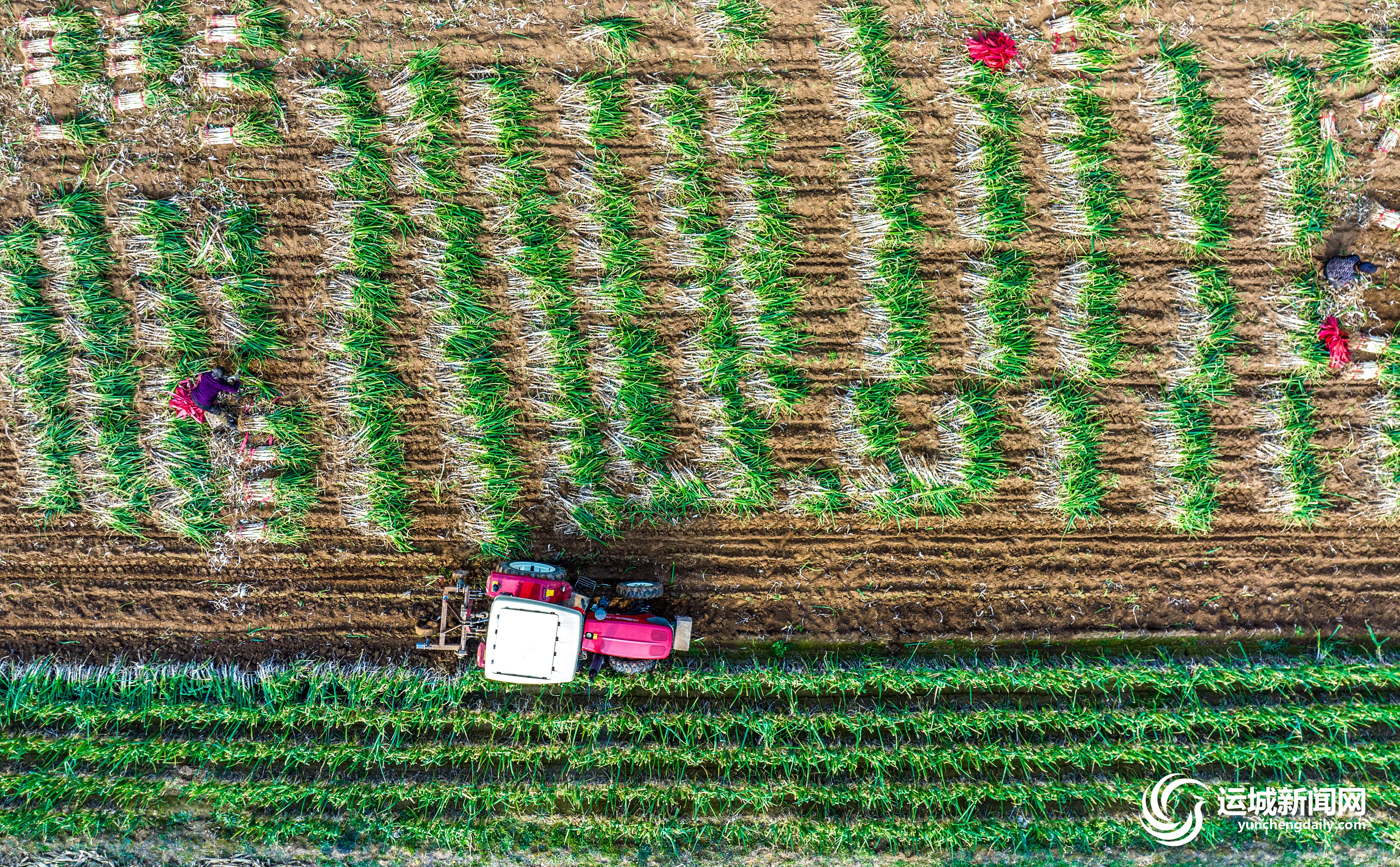 ▲11月19日,万荣县南张乡薛里村村民在收获大葱。初冬时节,万荣县4万多亩大葱喜获丰收,村民们忙着将大葱打捆、装车外销,田间一派繁忙景象。
