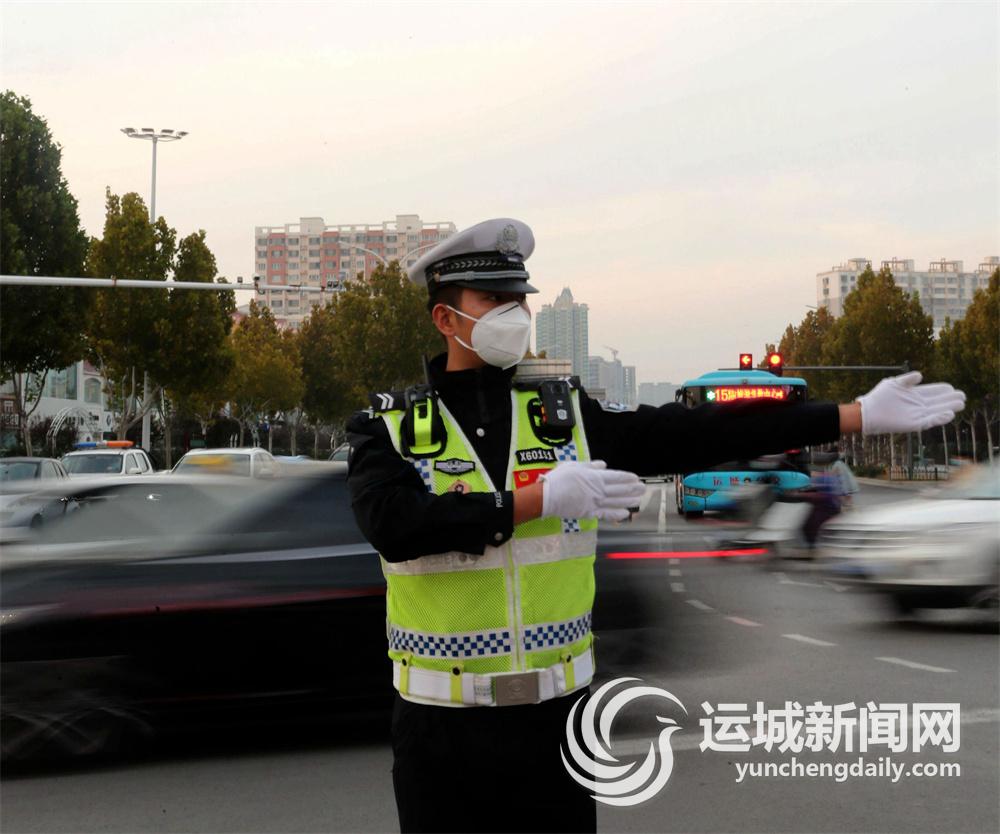 ▲11月15日,盐湖交警大队二中队民辅警在辖区八里铺岗指挥车辆有序通行。